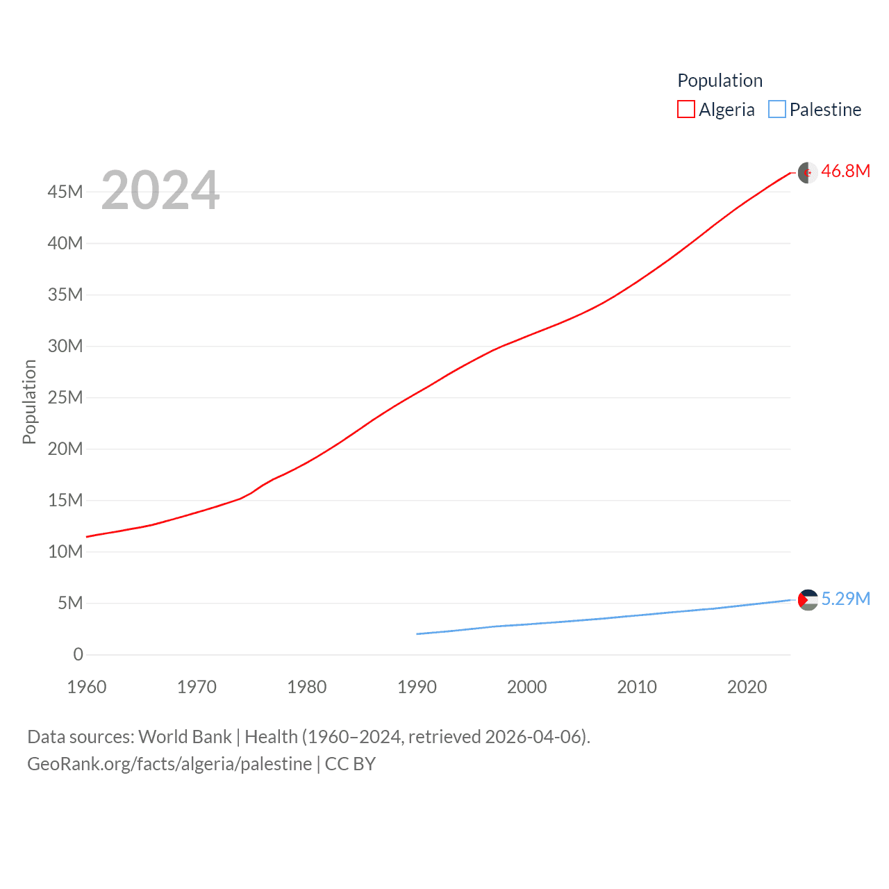 Algeria has a population of 46.8M (ranked 33/197), compared with 5.29M in Palestine (ranked 122/197). Algeria's land area is 919,595 sq mi versus 2,326 sq mi for Palestine (ranked 10th vs. 164th).
