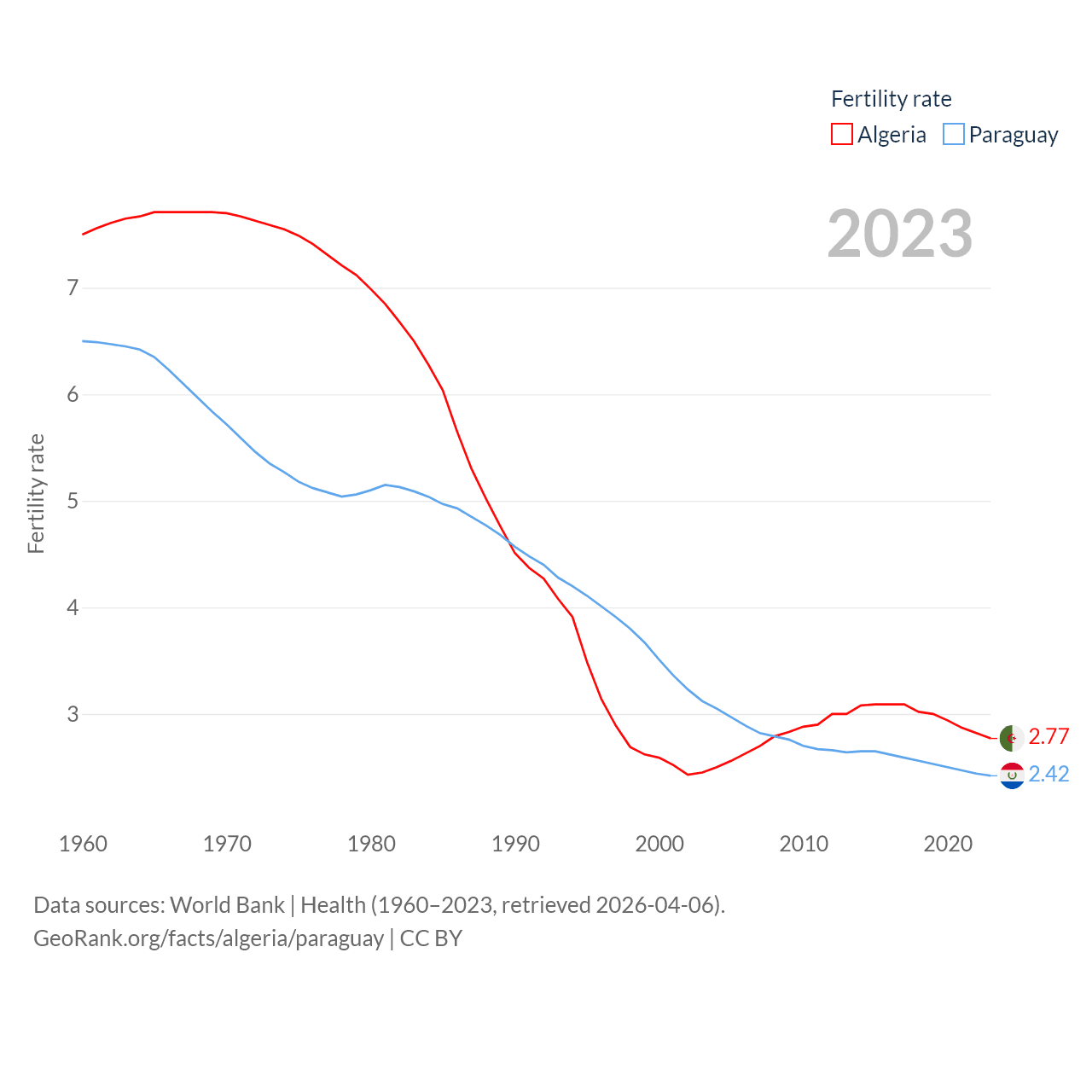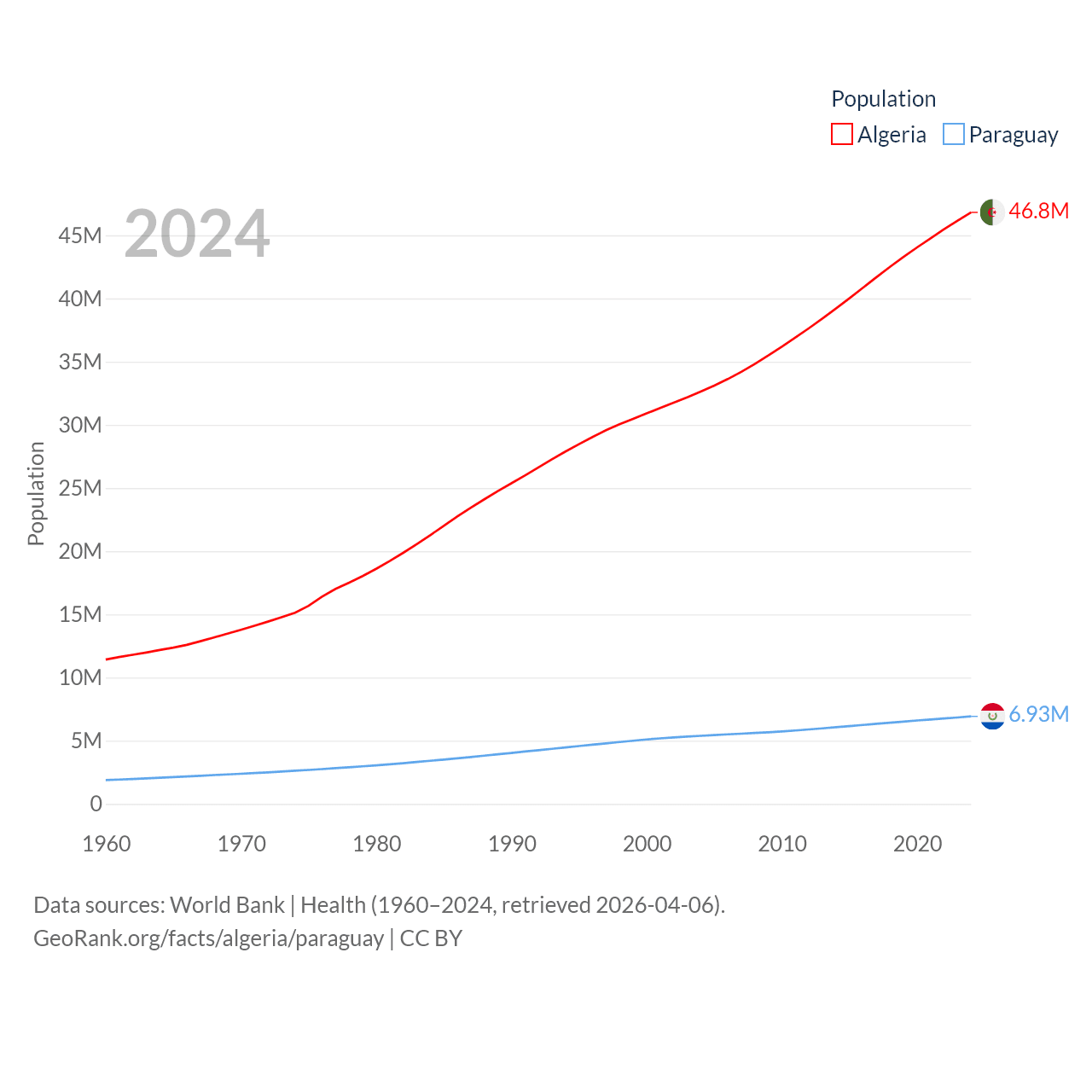 Algeria has a population of 46.8M (ranked 33/197), compared with 6.93M in Paraguay (ranked 107/197). Algeria's land area is 919,595 sq mi versus 152,901 sq mi for Paraguay (ranked 10th vs. 59th).