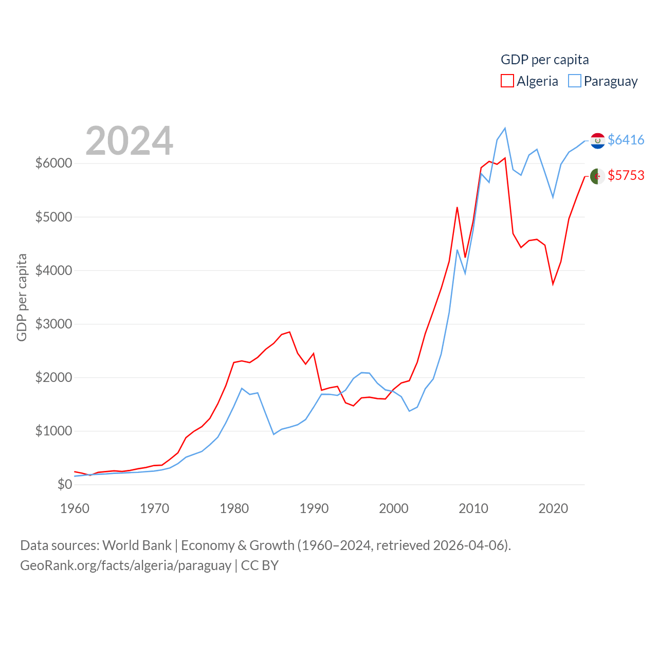 By GDP, Algeria ranks 51/197 ($269B) and Paraguay ranks 98/197 ($44.5B). By GDP per capita, Algeria ranks 114/197 ($5,753), while Paraguay ranks 109/197 ($6,416).