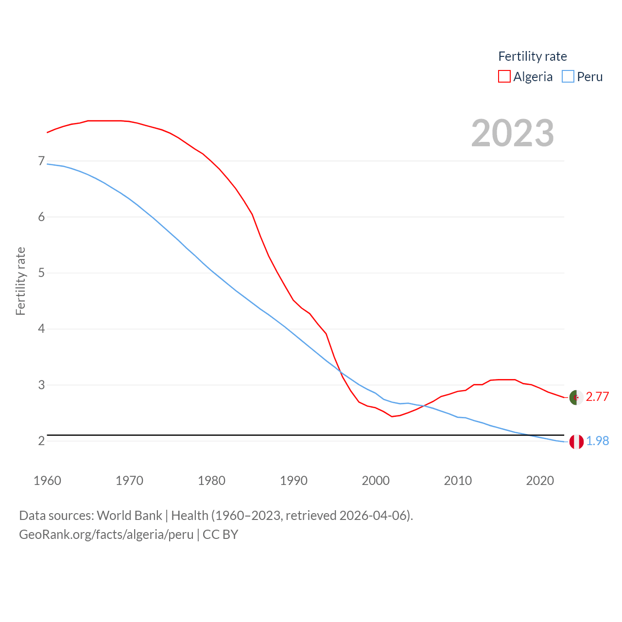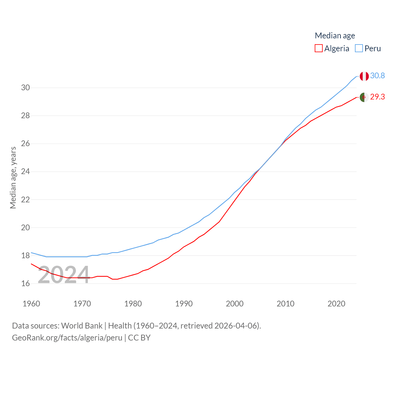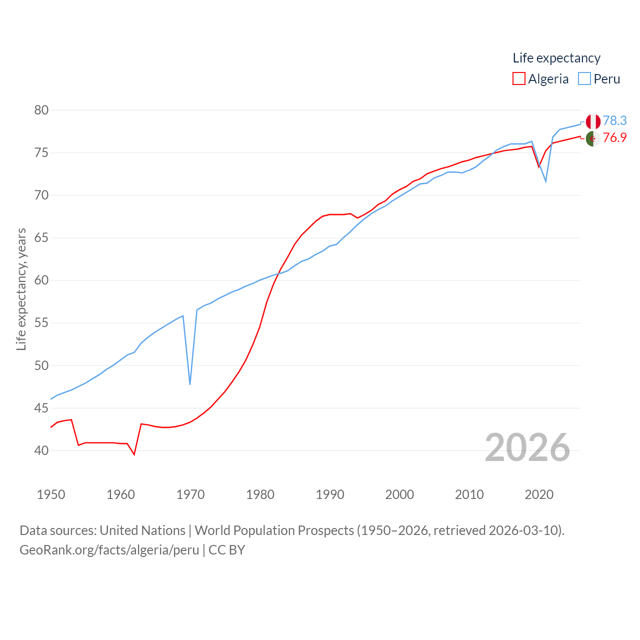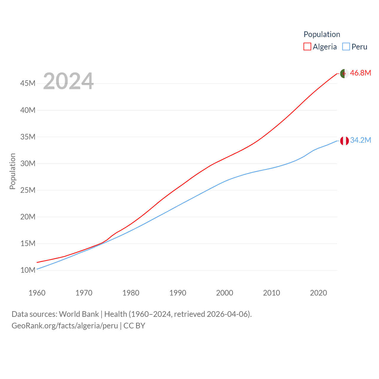 Algeria has a population of 46.8M (ranked 33/197), compared with 34.2M in Peru (ranked 48/197). Algeria's land area is 919,595 sq mi versus 494,211 sq mi for Peru (ranked 10th vs. 19th).