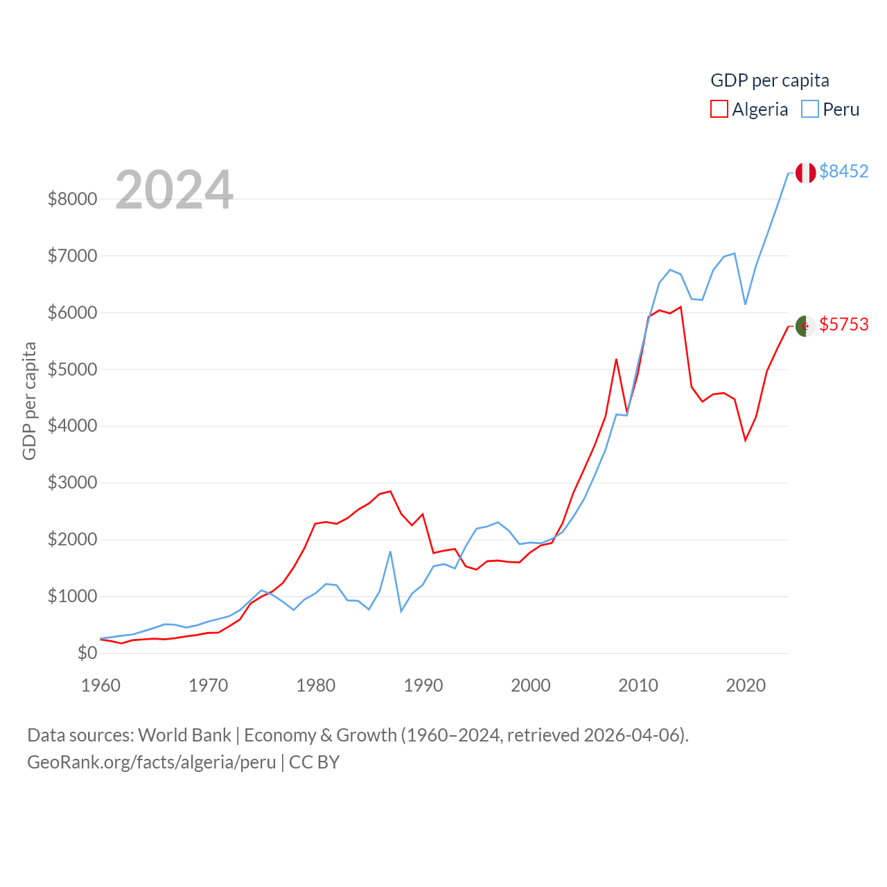 By GDP, Algeria ranks 51/197 ($269B) and Peru ranks 49/197 ($289B). By GDP per capita, Algeria ranks 114/197 ($5,753), while Peru ranks 91/197 ($8,452).