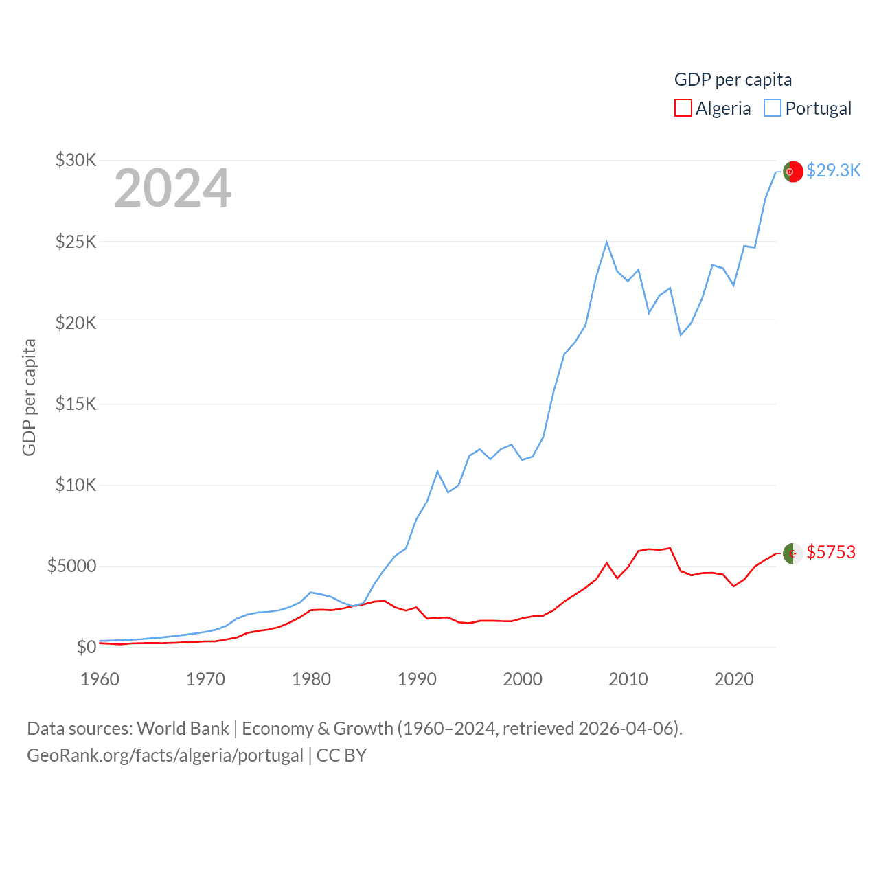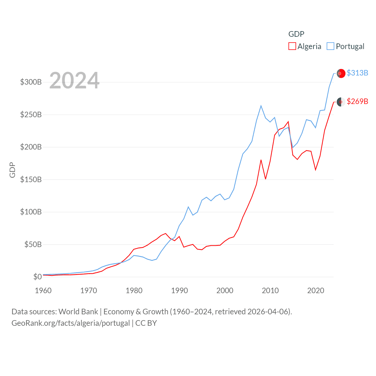 By GDP, Algeria ranks 51/197 ($269B) and Portugal ranks 46/197 ($313B). By GDP per capita, Algeria ranks 114/197 ($5,753), while Portugal ranks 44/197 ($29,292).