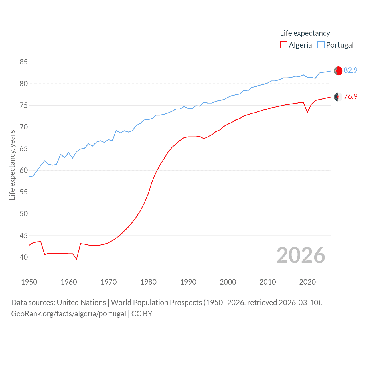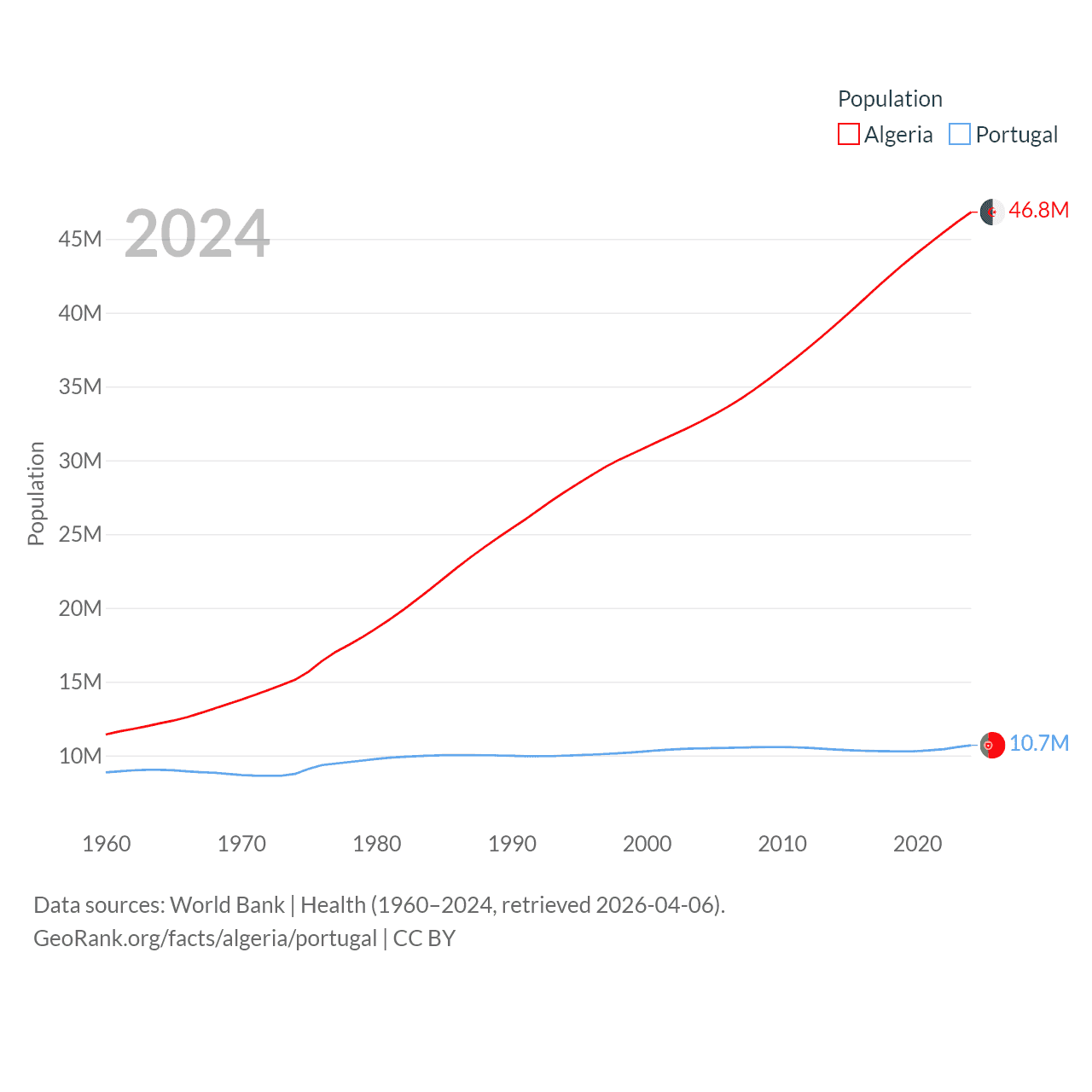 Algeria has a population of 46.8M (ranked 33/197), compared with 10.7M in Portugal (ranked 90/197). Algeria's land area is 919,595 sq mi versus 35,369 sq mi for Portugal (ranked 10th vs. 108th).