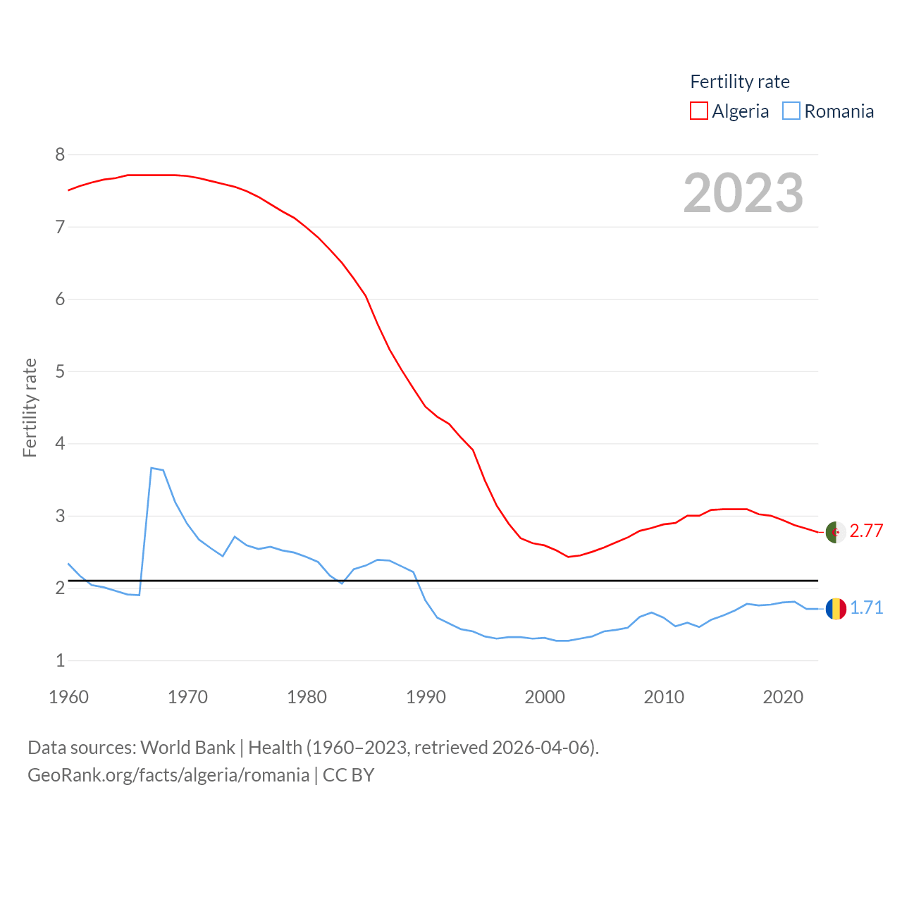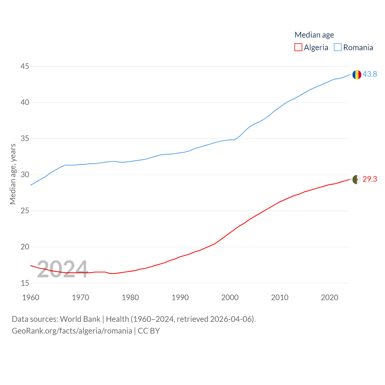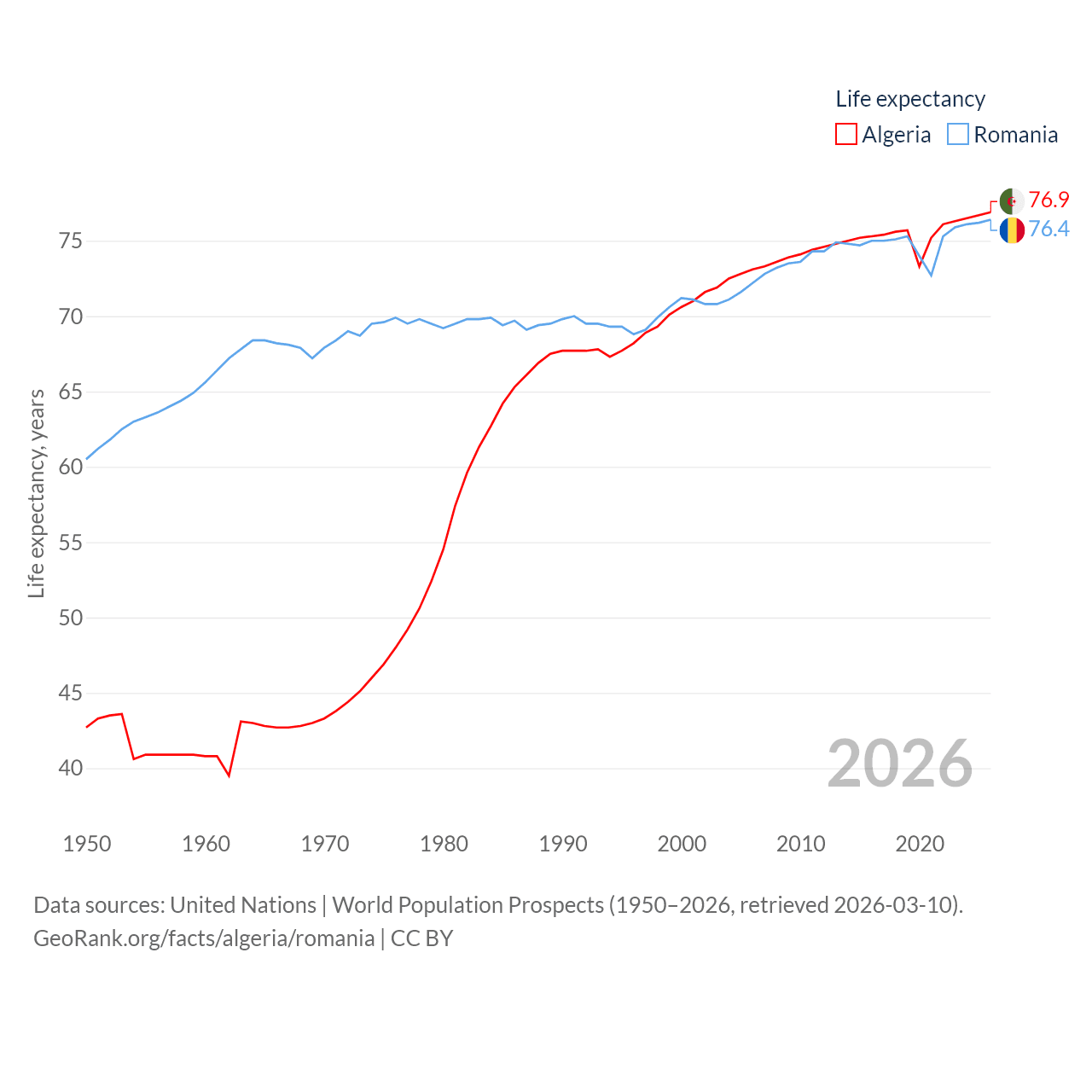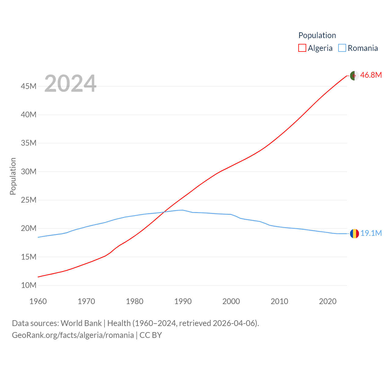 Algeria has a population of 46.8M (ranked 33/197), compared with 19.1M in Romania (ranked 67/197). Algeria's land area is 919,595 sq mi versus 88,834 sq mi for Romania (ranked 10th vs. 80th).