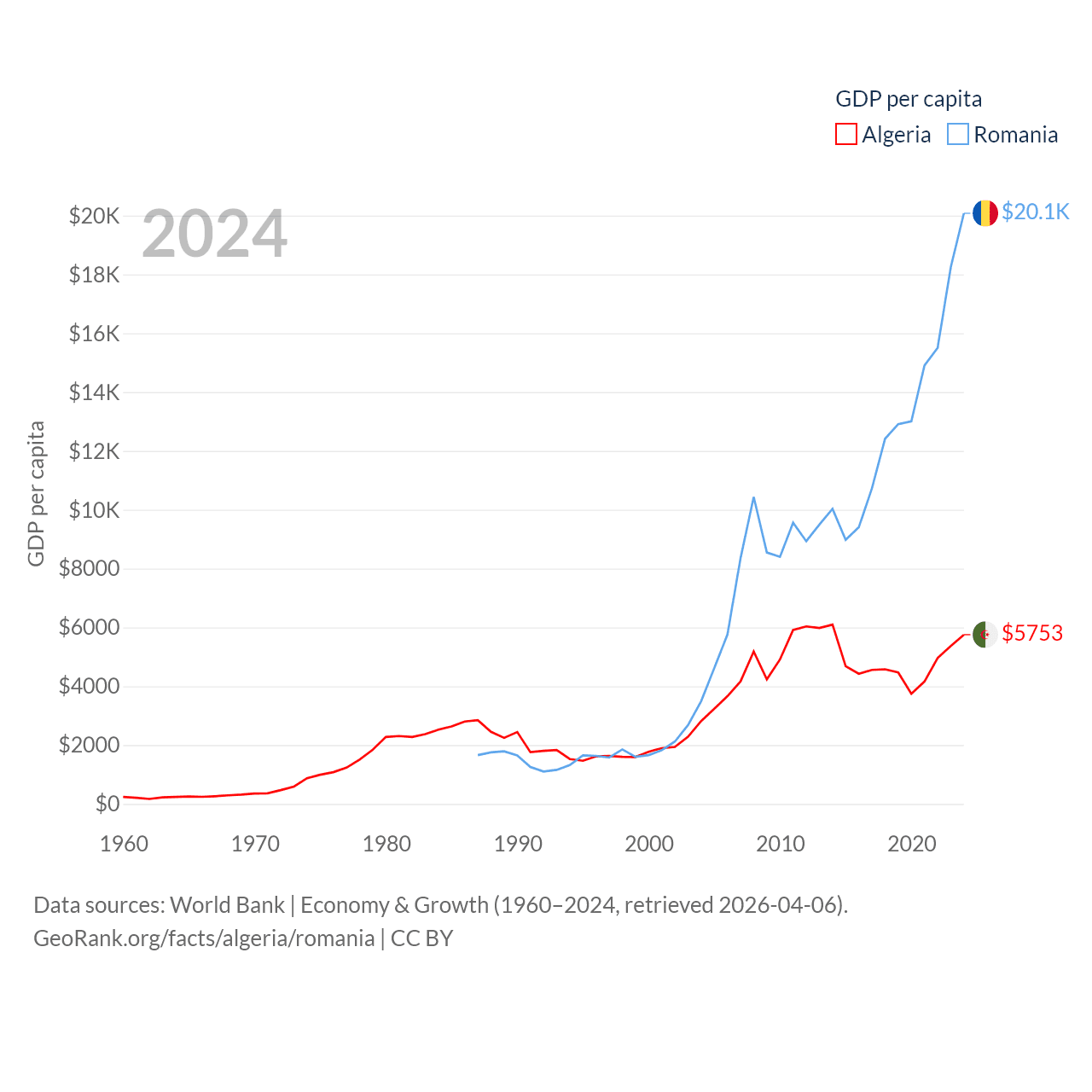 By GDP, Algeria ranks 51/197 ($269B) and Romania ranks 42/197 ($383B). By GDP per capita, Algeria ranks 114/197 ($5,753), while Romania ranks 58/197 ($20,080).