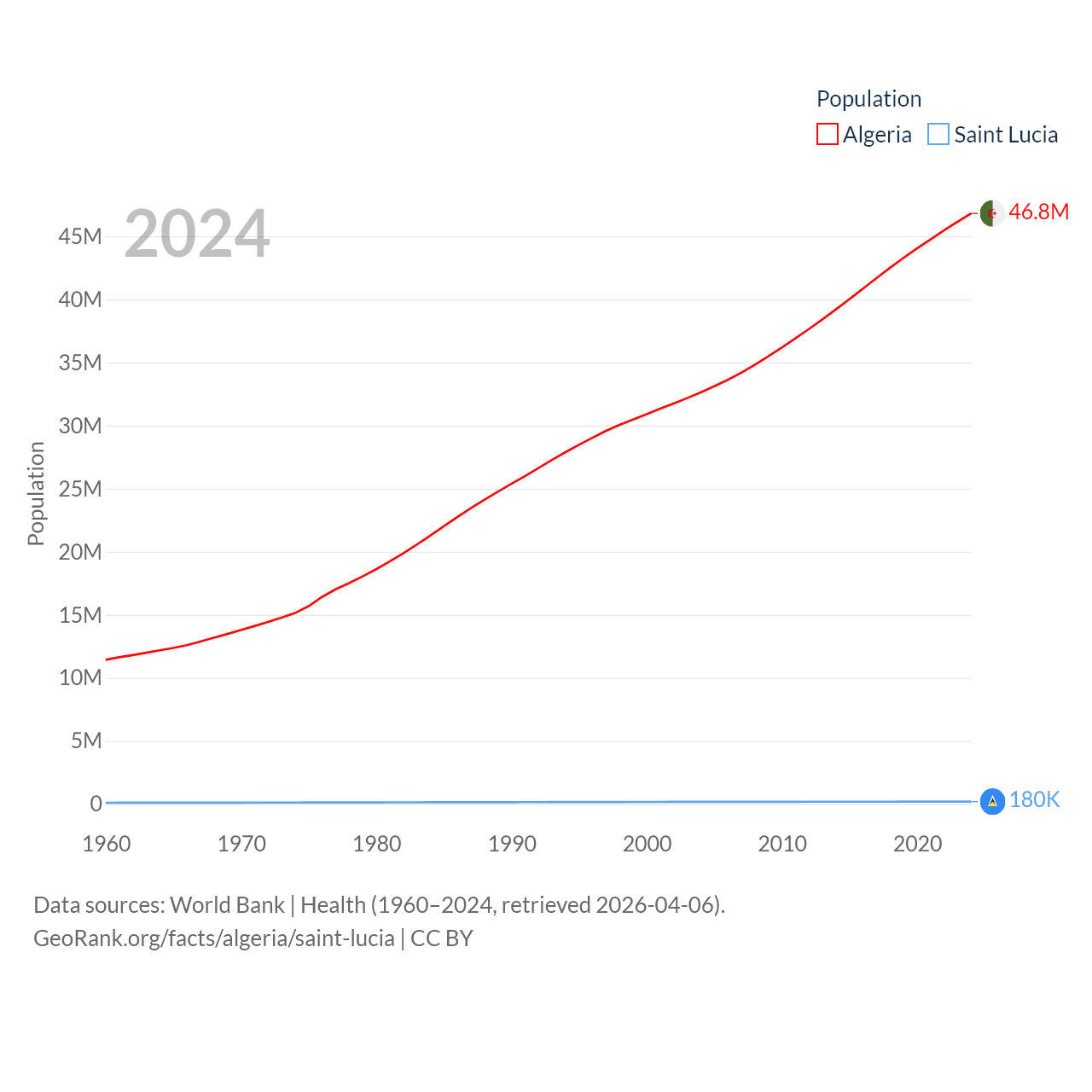 Algeria has a population of 46.8M (ranked 33/197), compared with 180K in Saint Lucia (ranked 178/197). Algeria's land area is 919,595 sq mi versus 235.5 sq mi for Saint Lucia (ranked 10th vs. 178th).