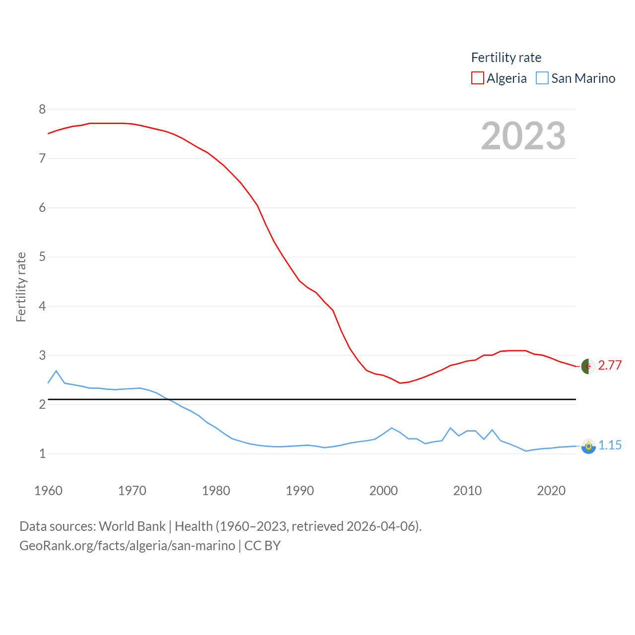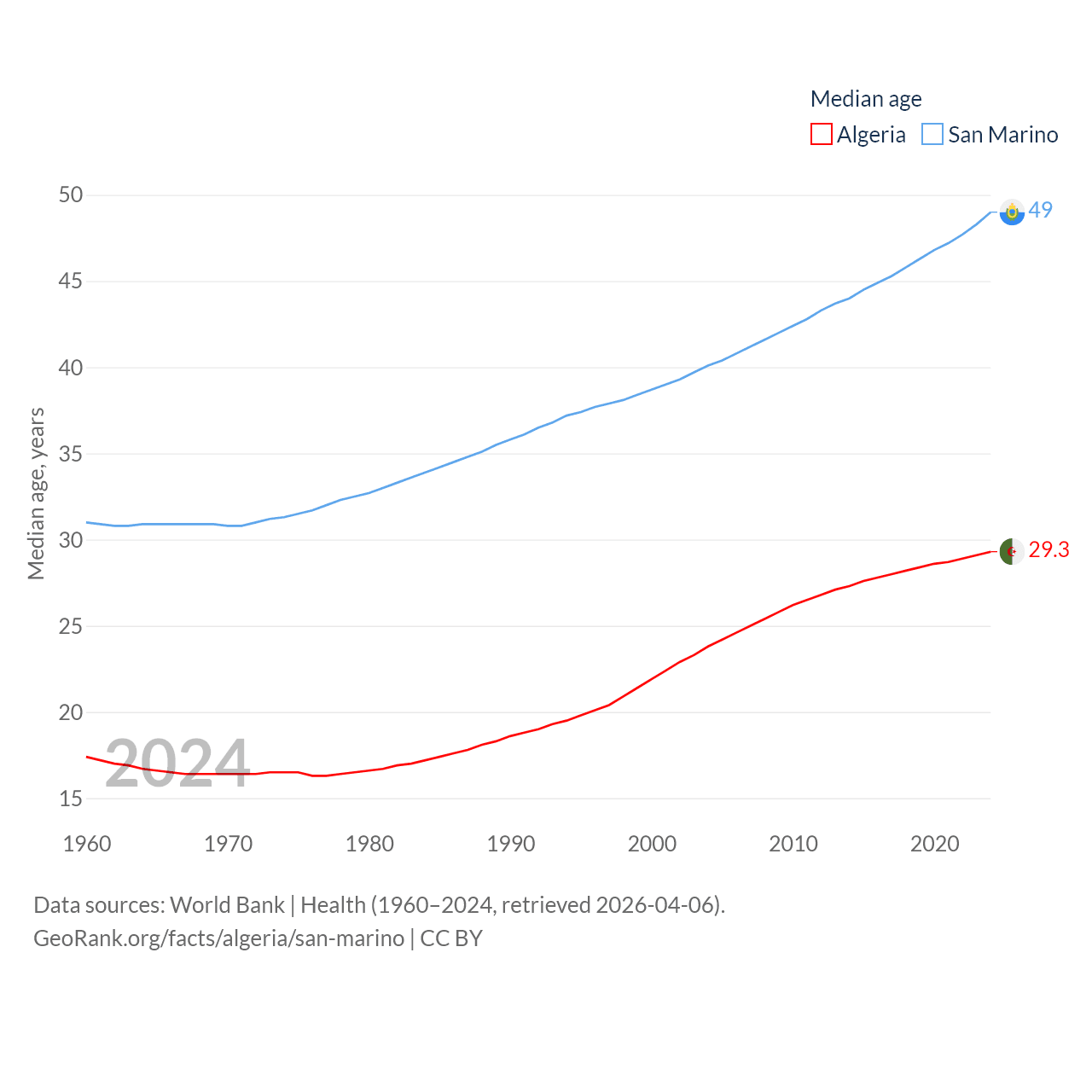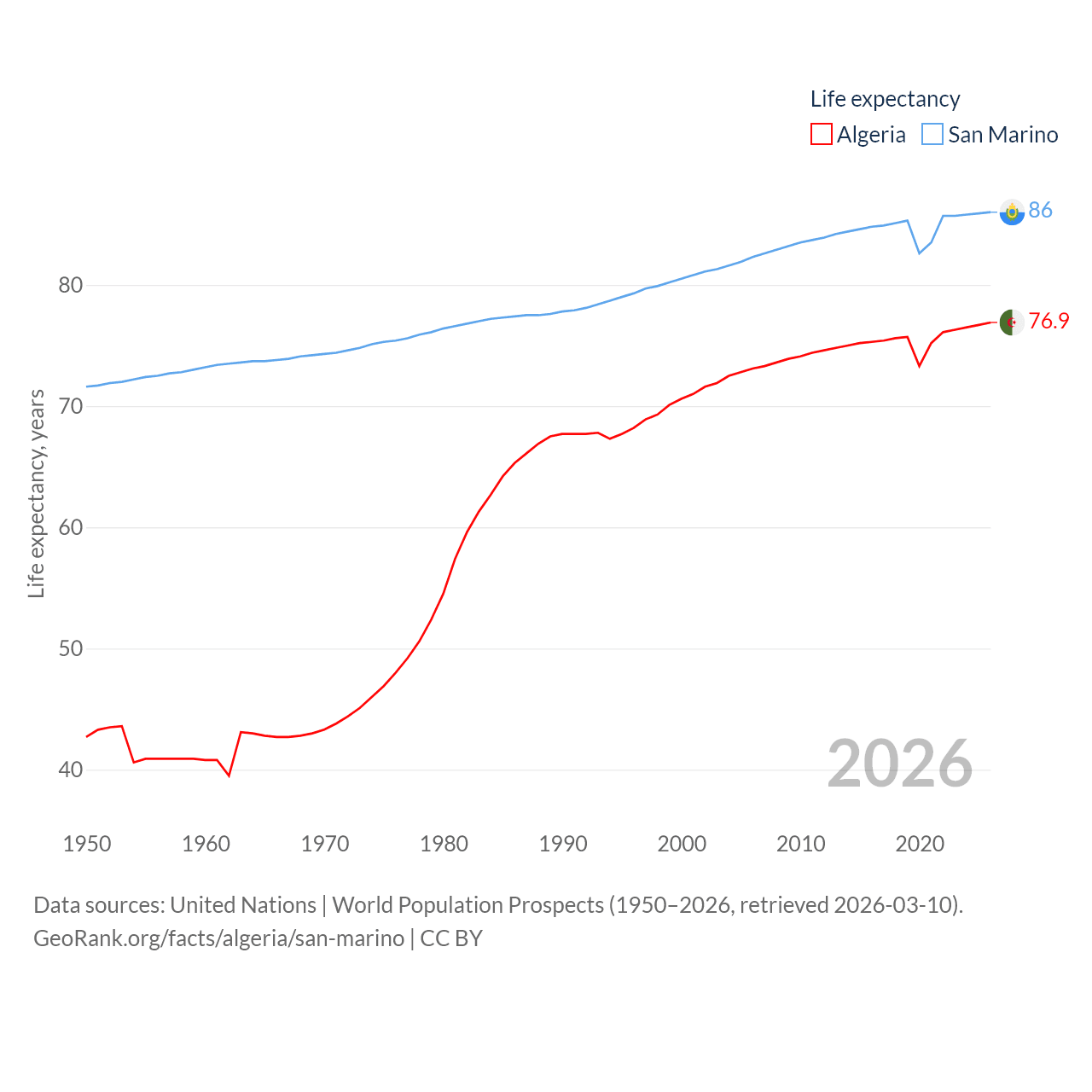 Algeria has a population of 46.8M (ranked 33/197), compared with 34K in San Marino (ranked 193/197). Algeria's land area is 919,595 sq mi versus 23.2 sq mi for San Marino (ranked 10th vs. 193rd).