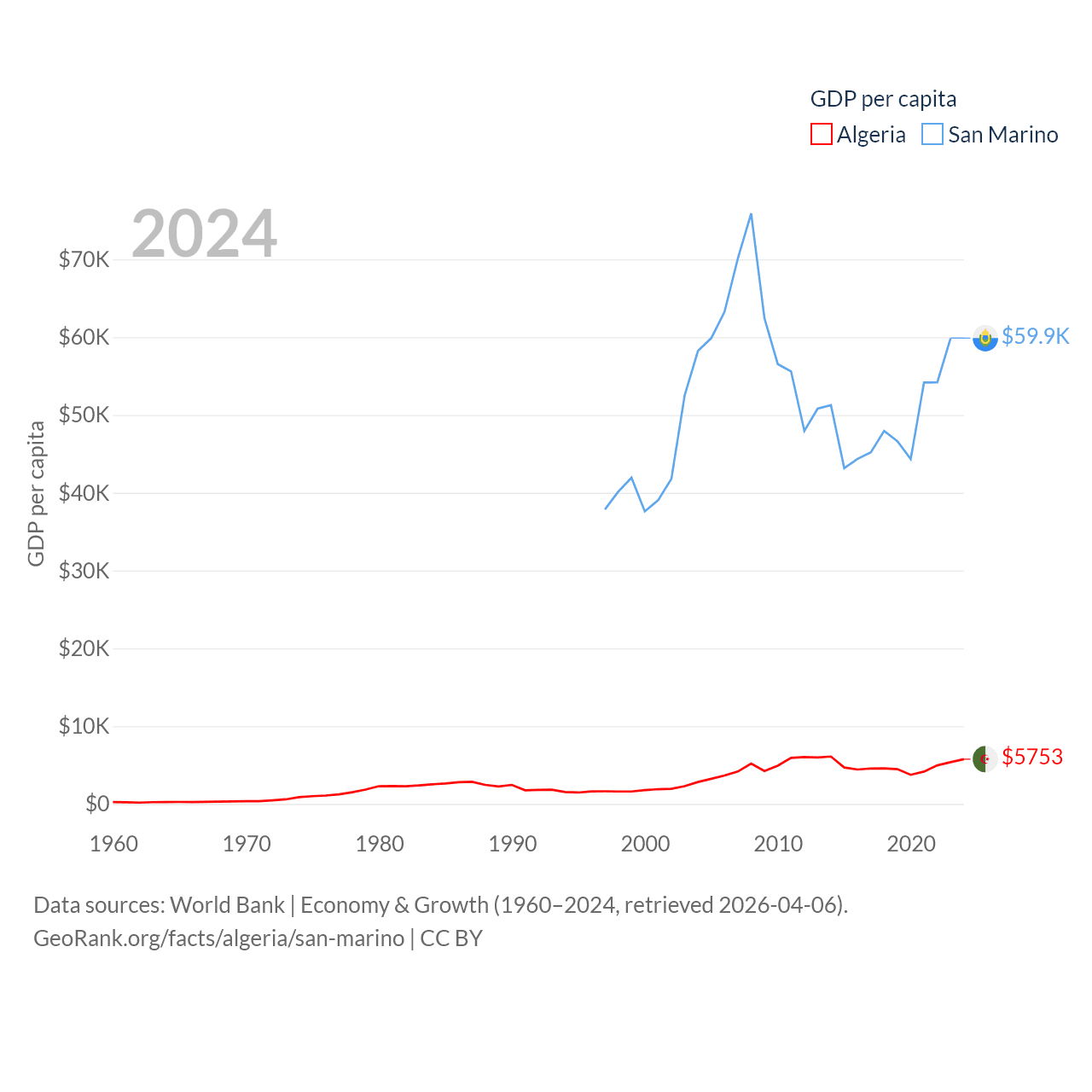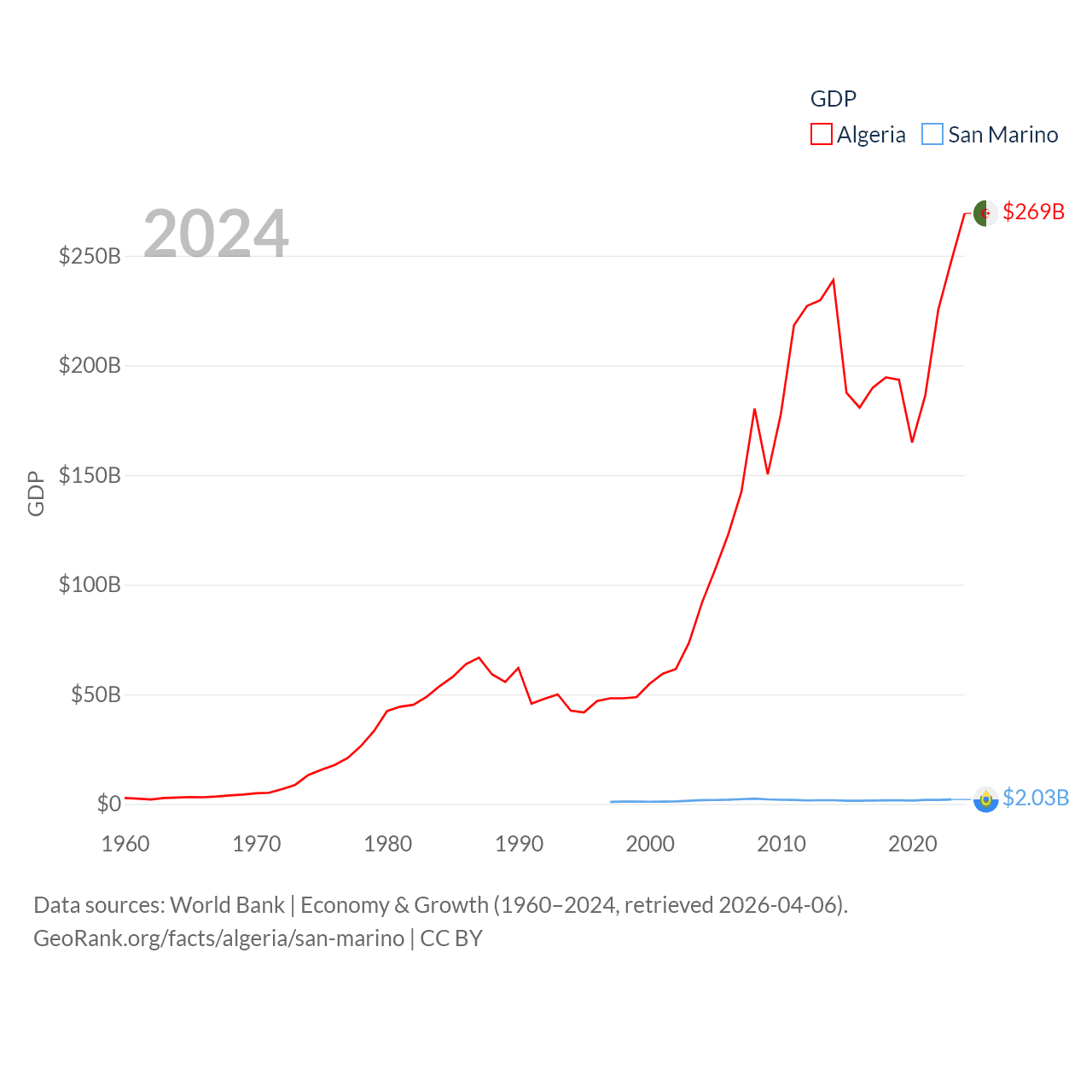 By GDP, Algeria ranks 51/197 ($269B) and San Marino ranks 180/197 ($2.03B). By GDP per capita, Algeria ranks 114/197 ($5,753), while San Marino ranks 15/197 ($59,880).