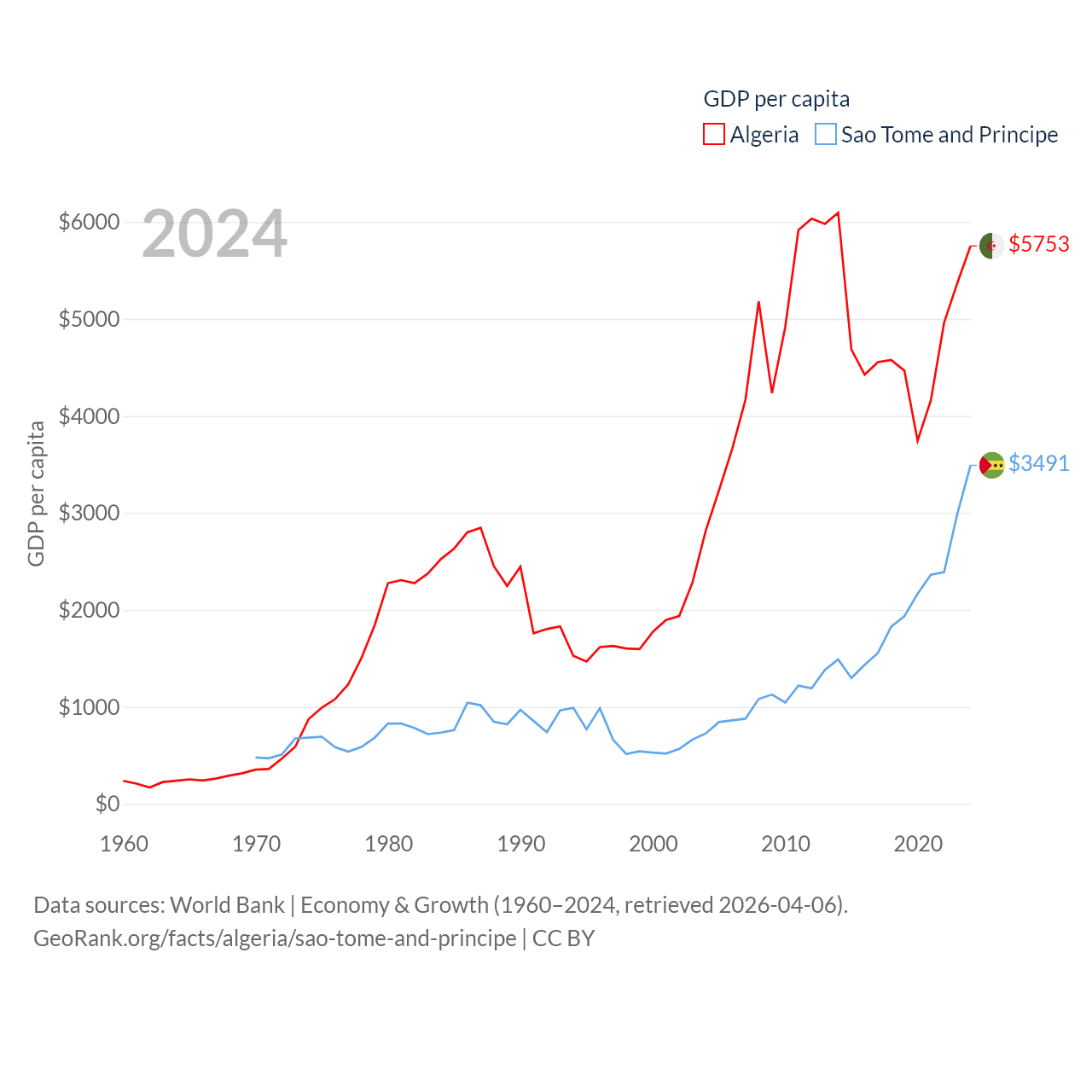 By GDP, Algeria ranks 51/197 ($269B) and Sao Tome and Principe ranks 189/197 ($822M). By GDP per capita, Algeria ranks 114/197 ($5,753), while Sao Tome and Principe ranks 134/197 ($3,491).