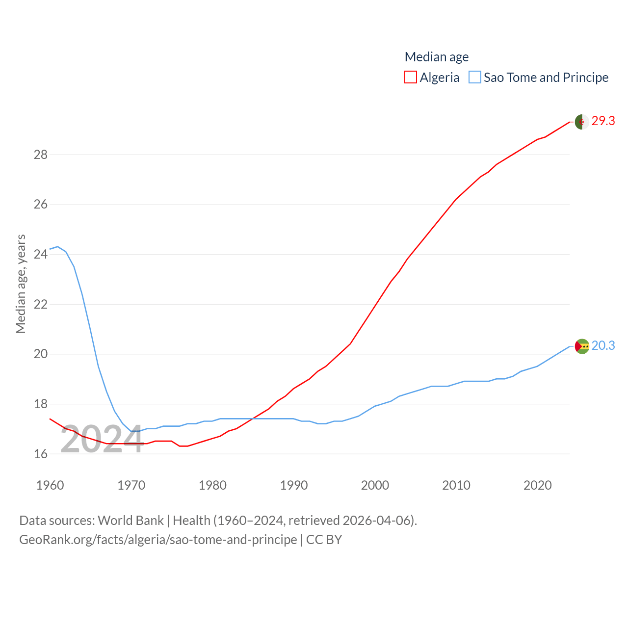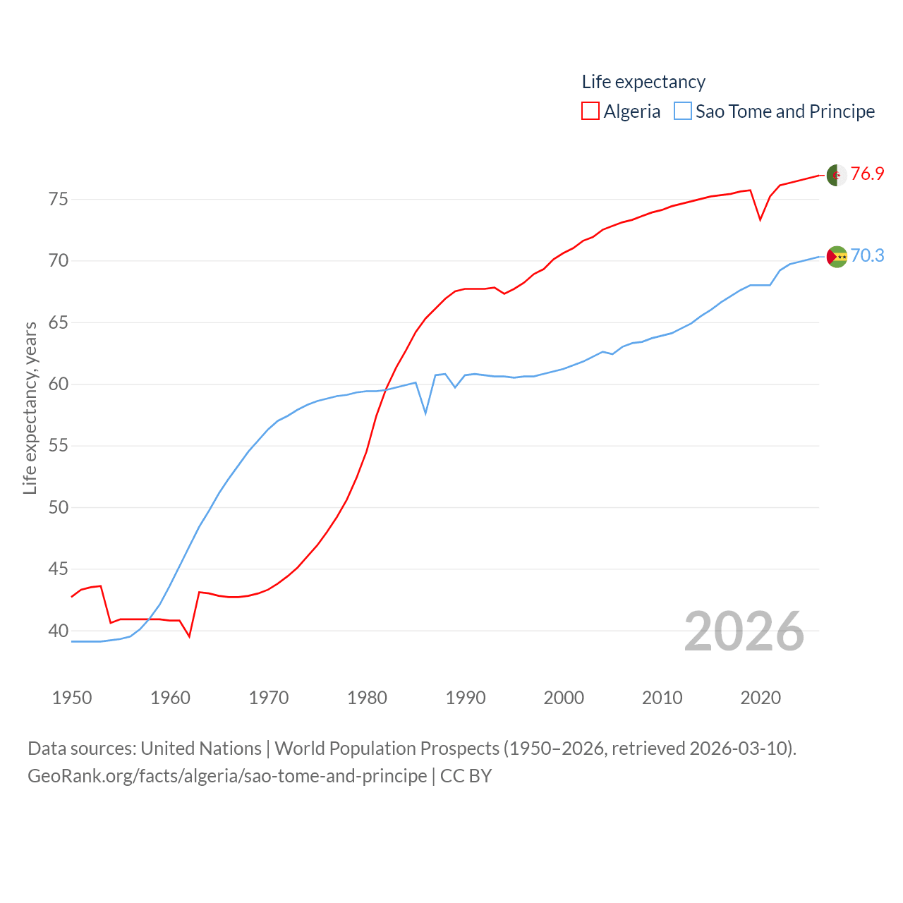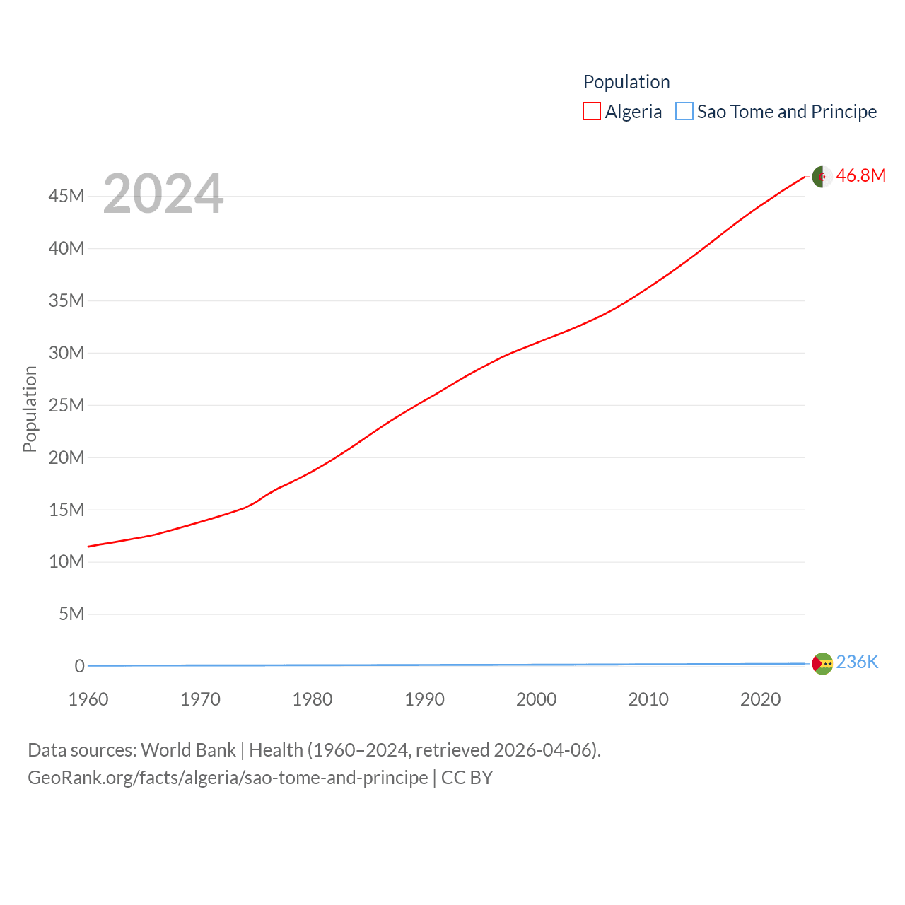 Algeria has a population of 46.8M (ranked 33/197), compared with 236K in Sao Tome and Principe (ranked 176/197). Algeria's land area is 919,595 sq mi versus 371 sq mi for Sao Tome and Principe (ranked 10th vs. 172nd).