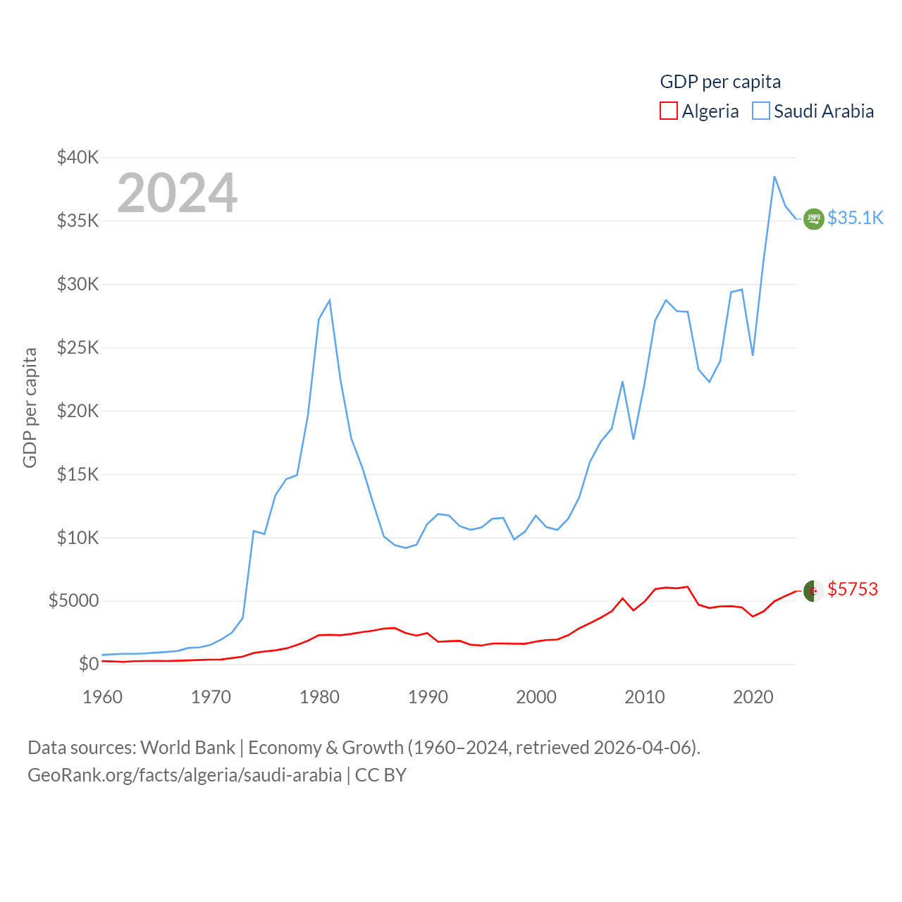 By GDP, Algeria ranks 51/197 ($269B) and Saudi Arabia ranks 18/197 ($1.24T). By GDP per capita, Algeria ranks 114/197 ($5,753), while Saudi Arabia ranks 33/197 ($35,122).