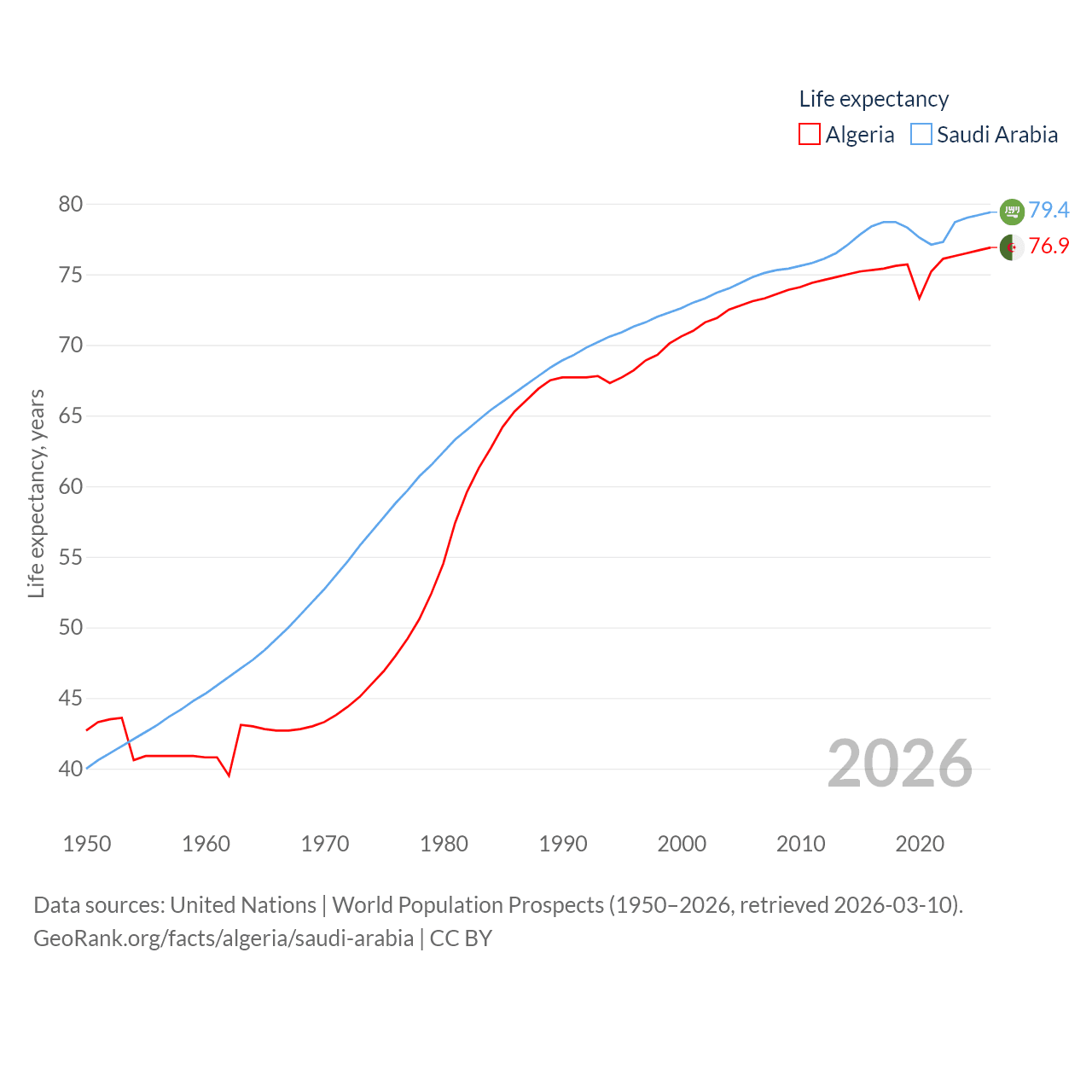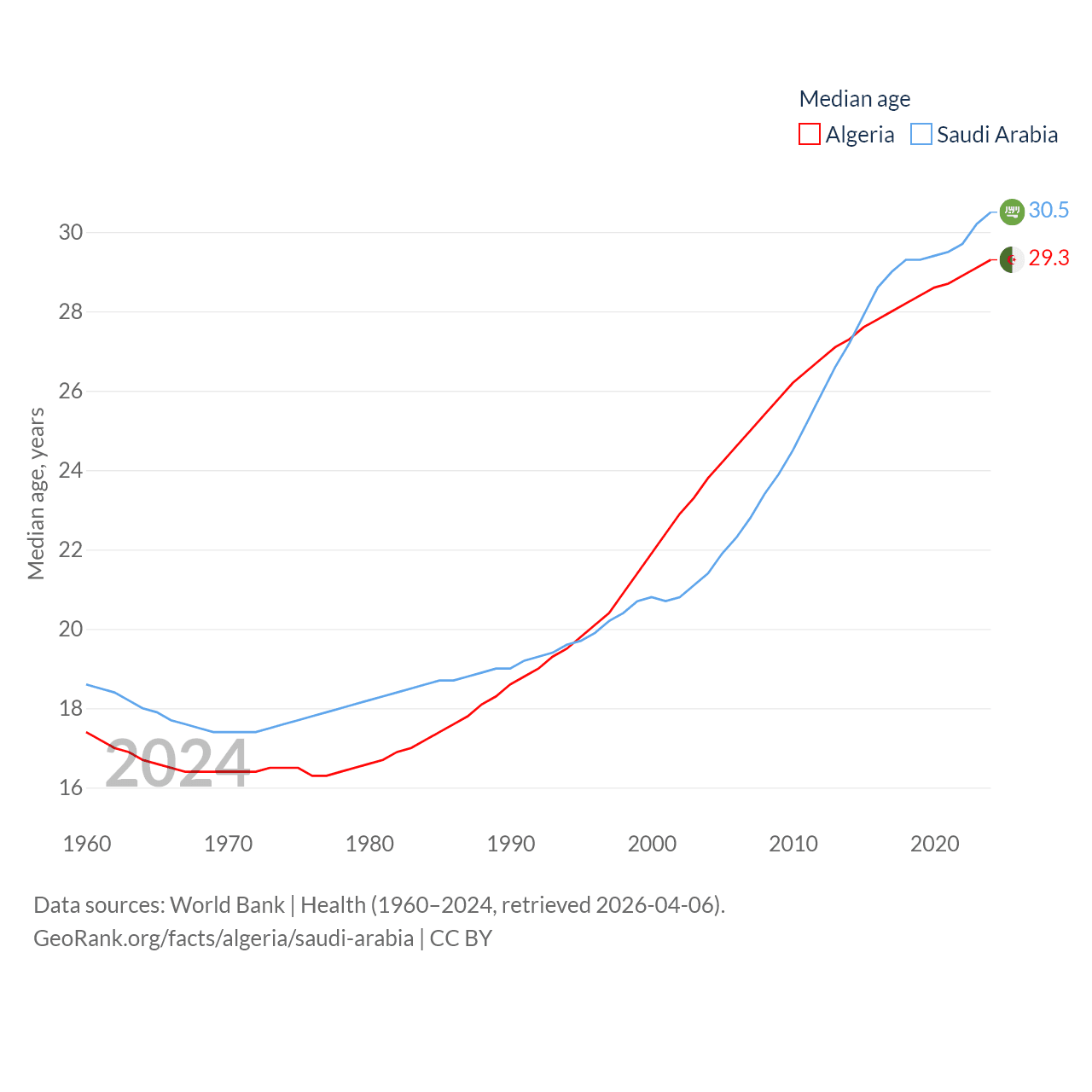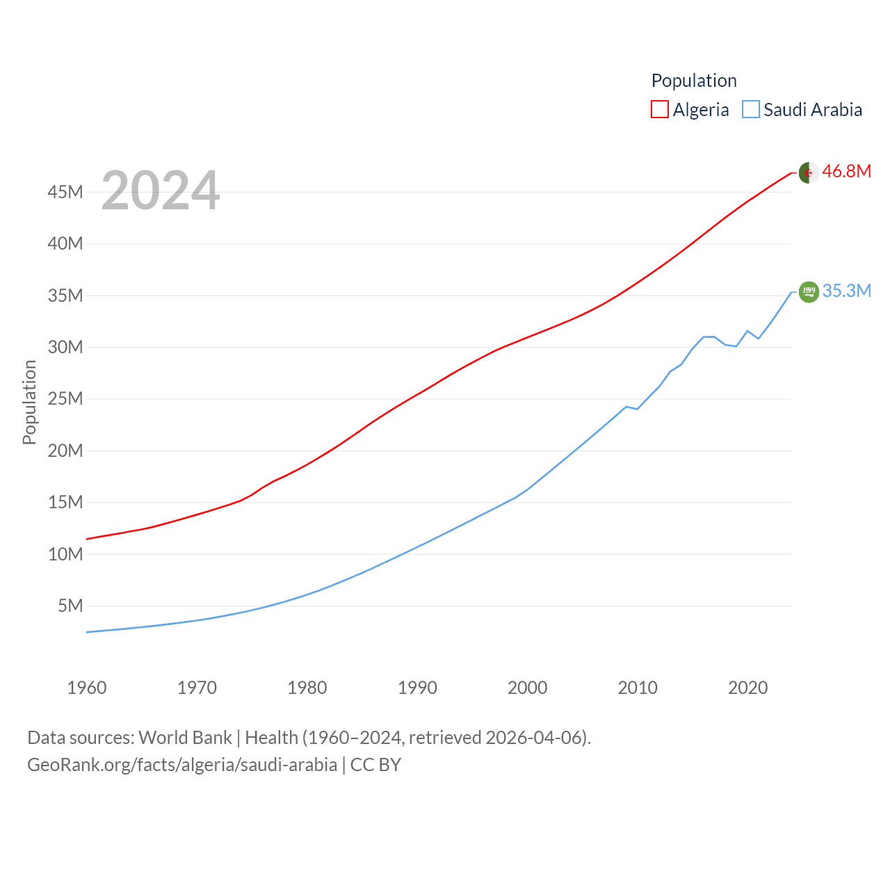 Algeria has a population of 46.8M (ranked 33/197), compared with 35.3M in Saudi Arabia (ranked 45/197). Algeria's land area is 919,595 sq mi versus 830,000 sq mi for Saudi Arabia (ranked 10th vs. 12th).