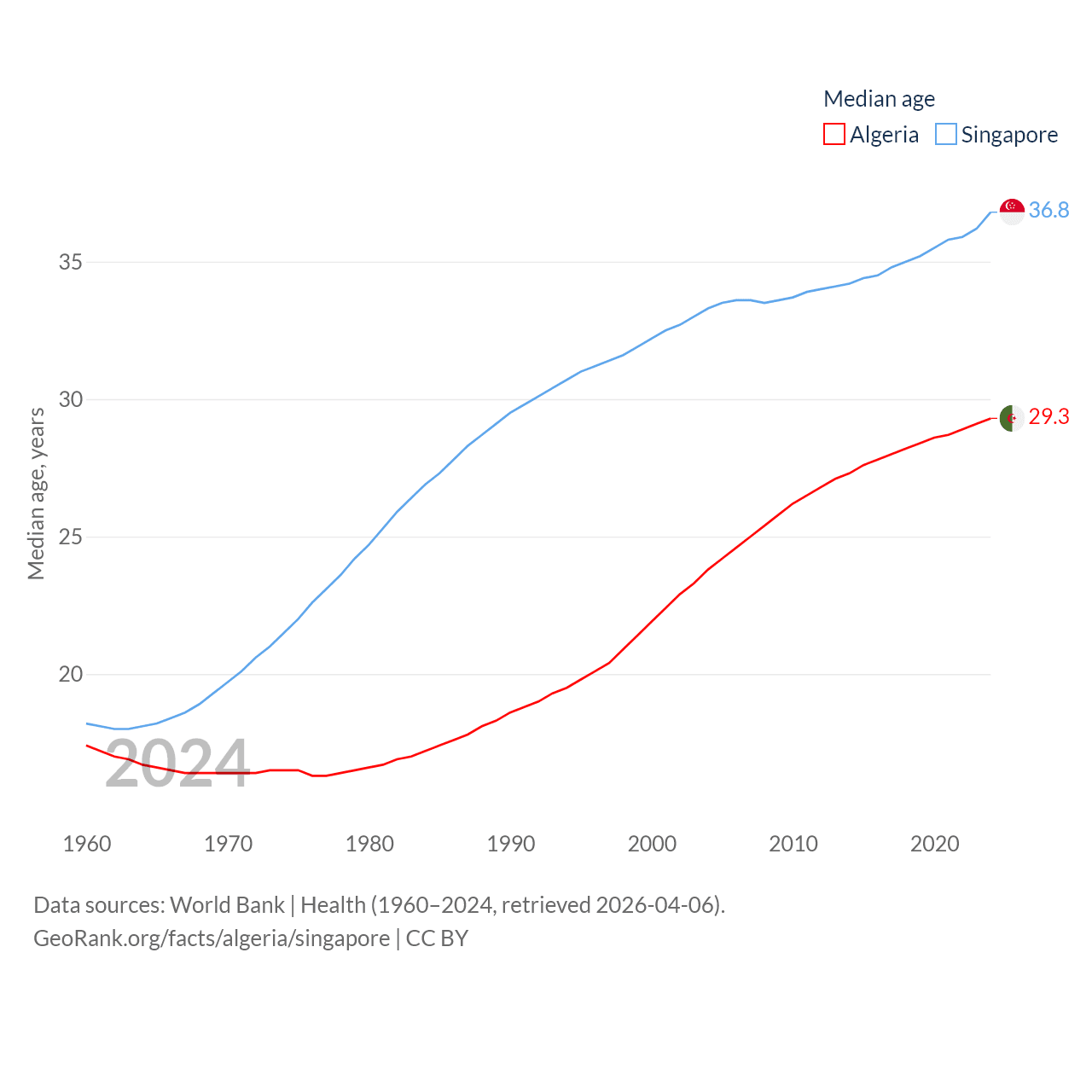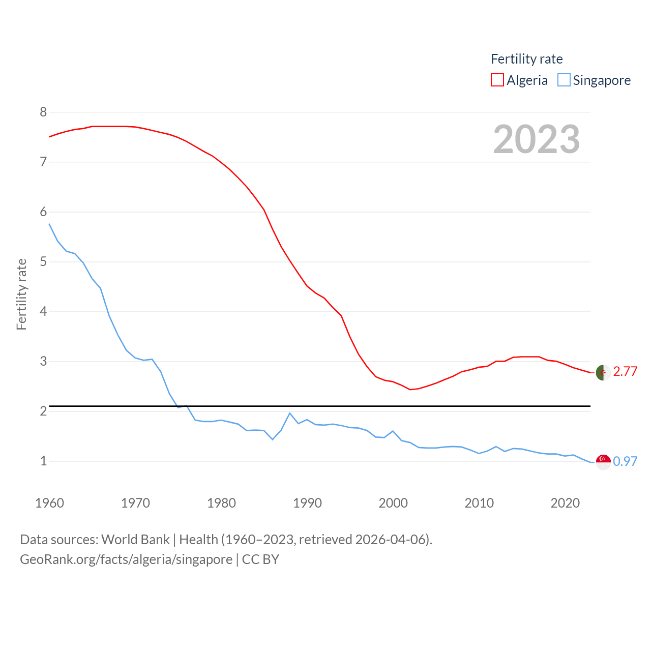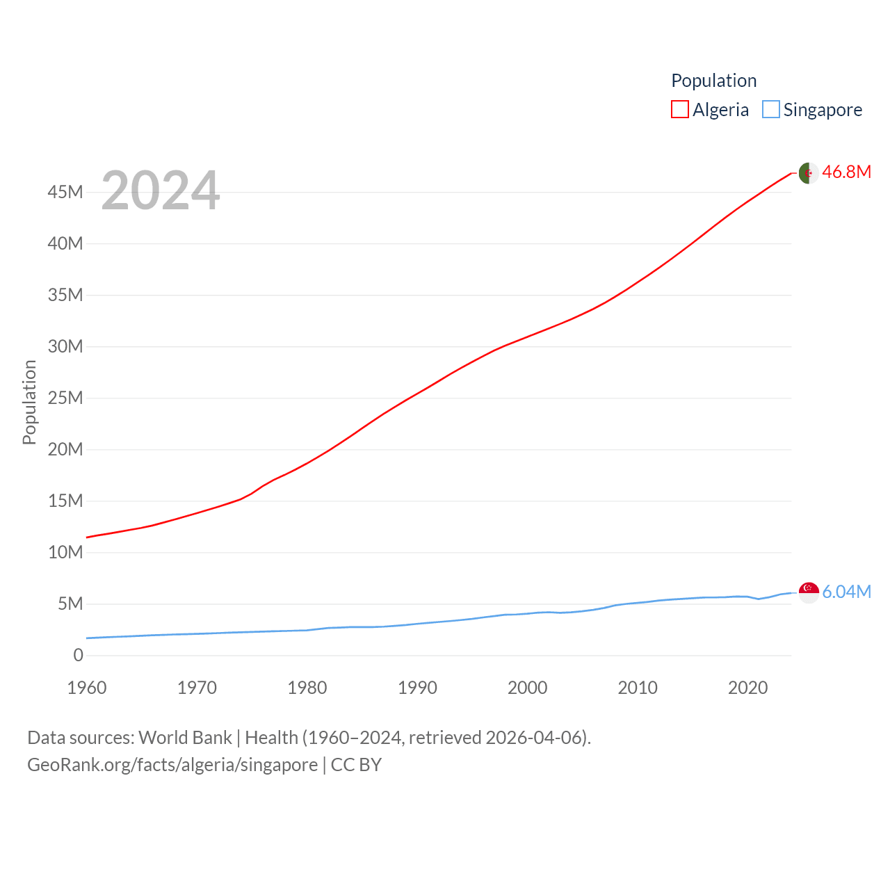 Algeria has a population of 46.8M (ranked 33/197), compared with 6.04M in Singapore (ranked 113/197). Algeria's land area is 919,595 sq mi versus 277.2 sq mi for Singapore (ranked 10th vs. 177th).