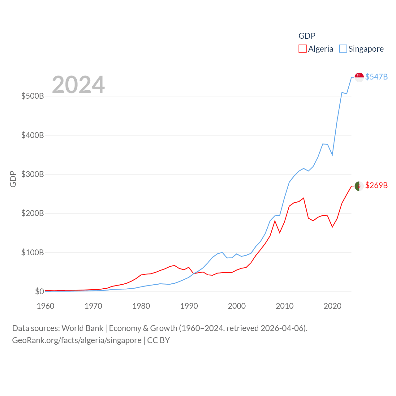 By GDP, Algeria ranks 51/197 ($269B) and Singapore ranks 28/197 ($547B). By GDP per capita, Algeria ranks 114/197 ($5,753), while Singapore ranks 7/197 ($90,674).