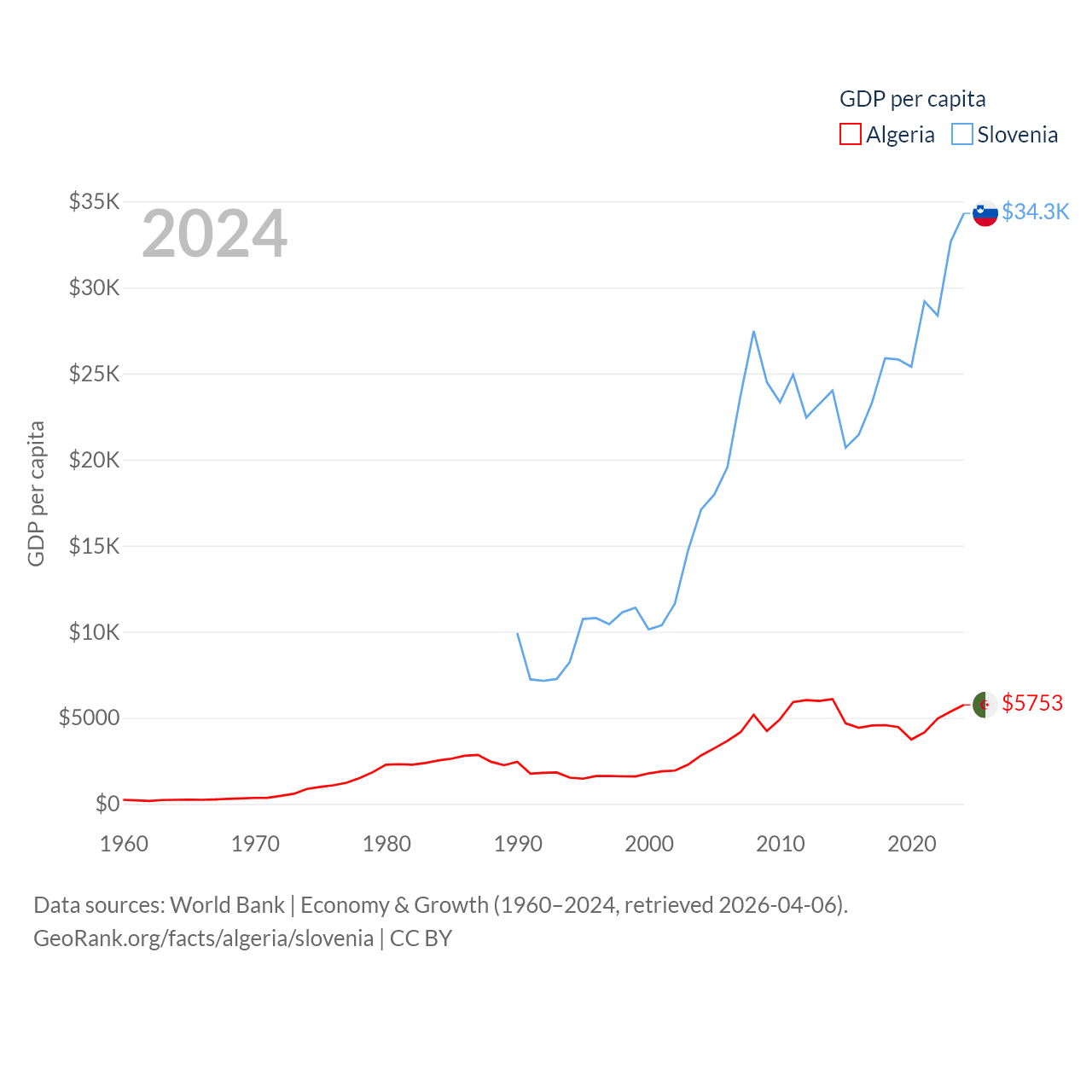 By GDP, Algeria ranks 51/197 ($269B) and Slovenia ranks 86/197 ($73B). By GDP per capita, Algeria ranks 114/197 ($5,753), while Slovenia ranks 34/197 ($34,301).