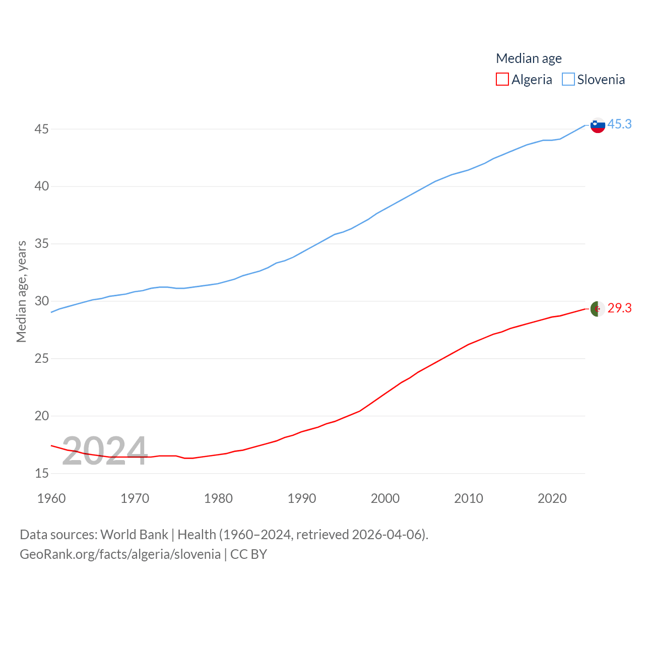 Algeria has a population of 46.8M (ranked 33/197), compared with 2.13M in Slovenia (ranked 147/197). Algeria's land area is 919,595 sq mi versus 7,774 sq mi for Slovenia (ranked 10th vs. 151st).