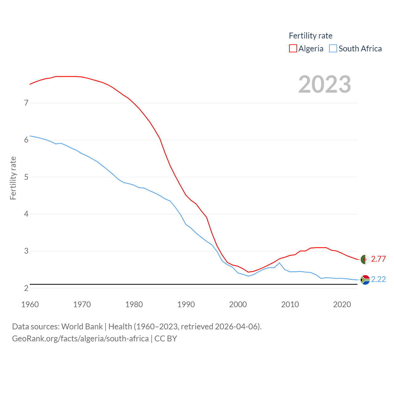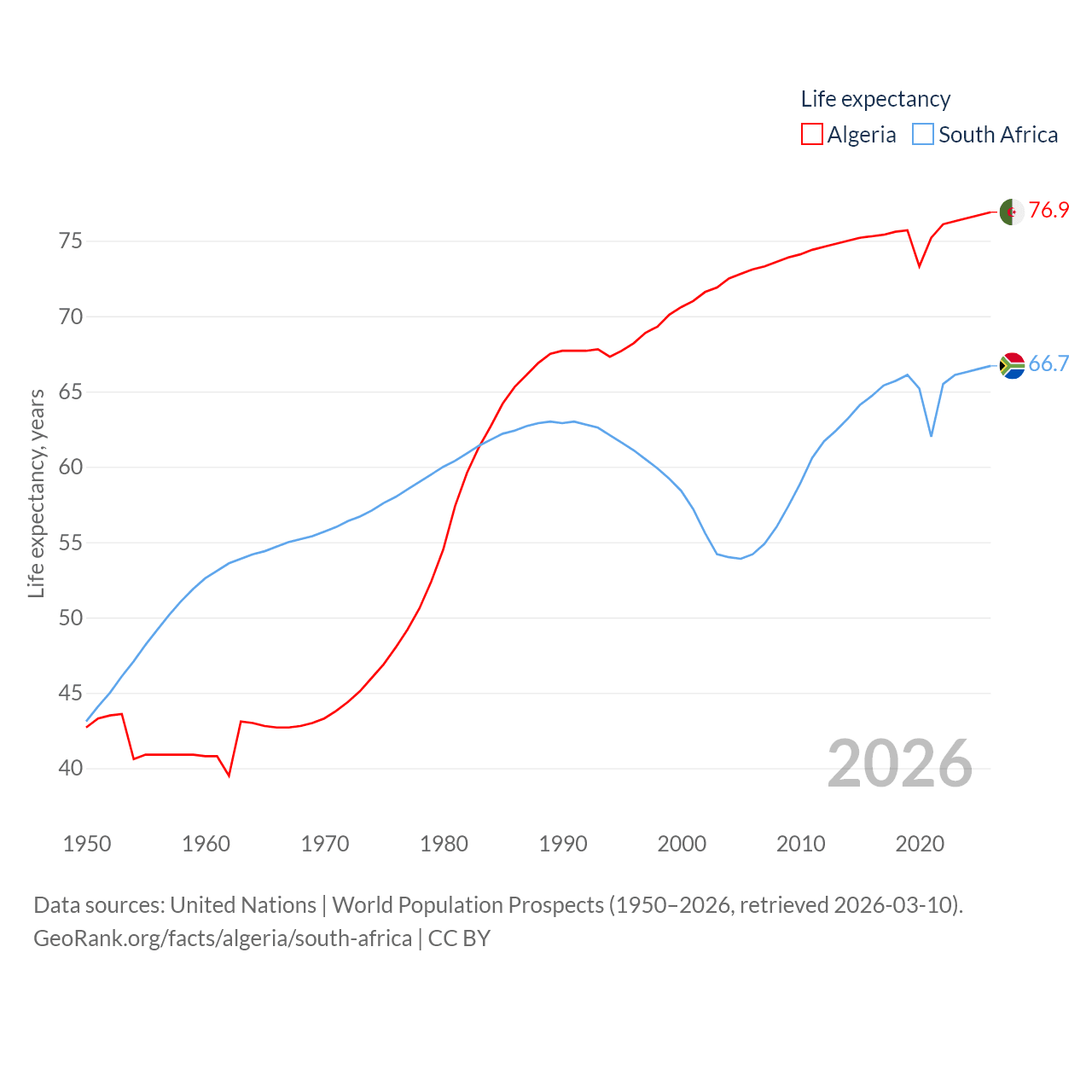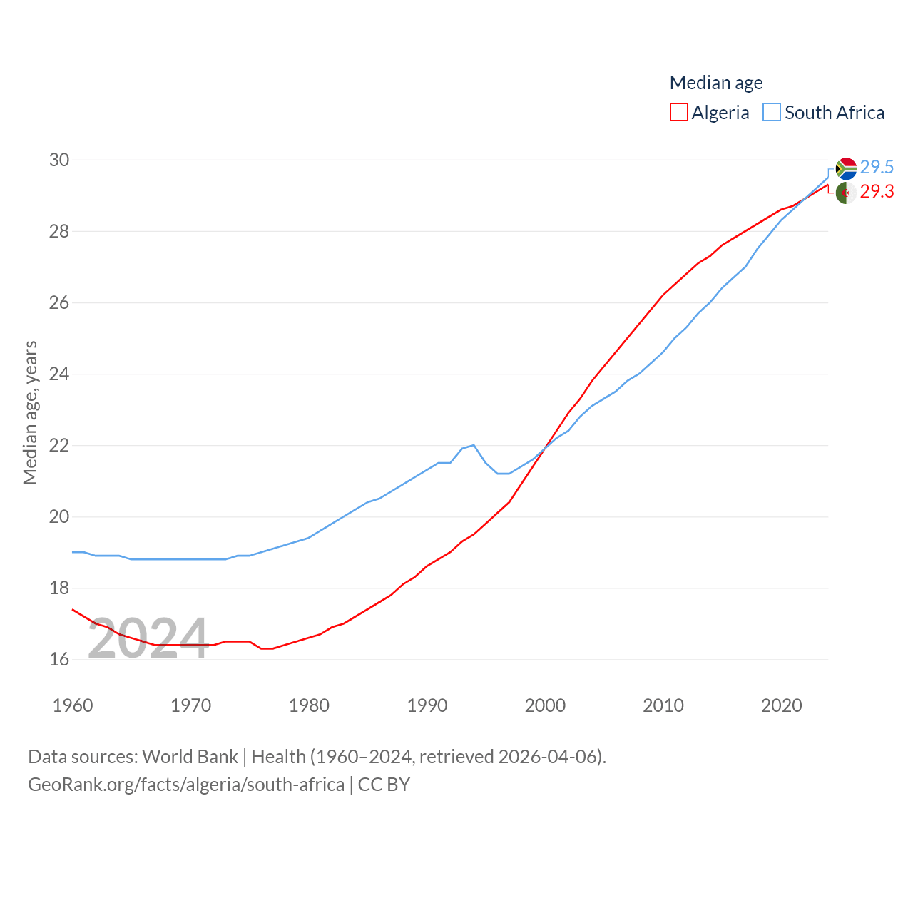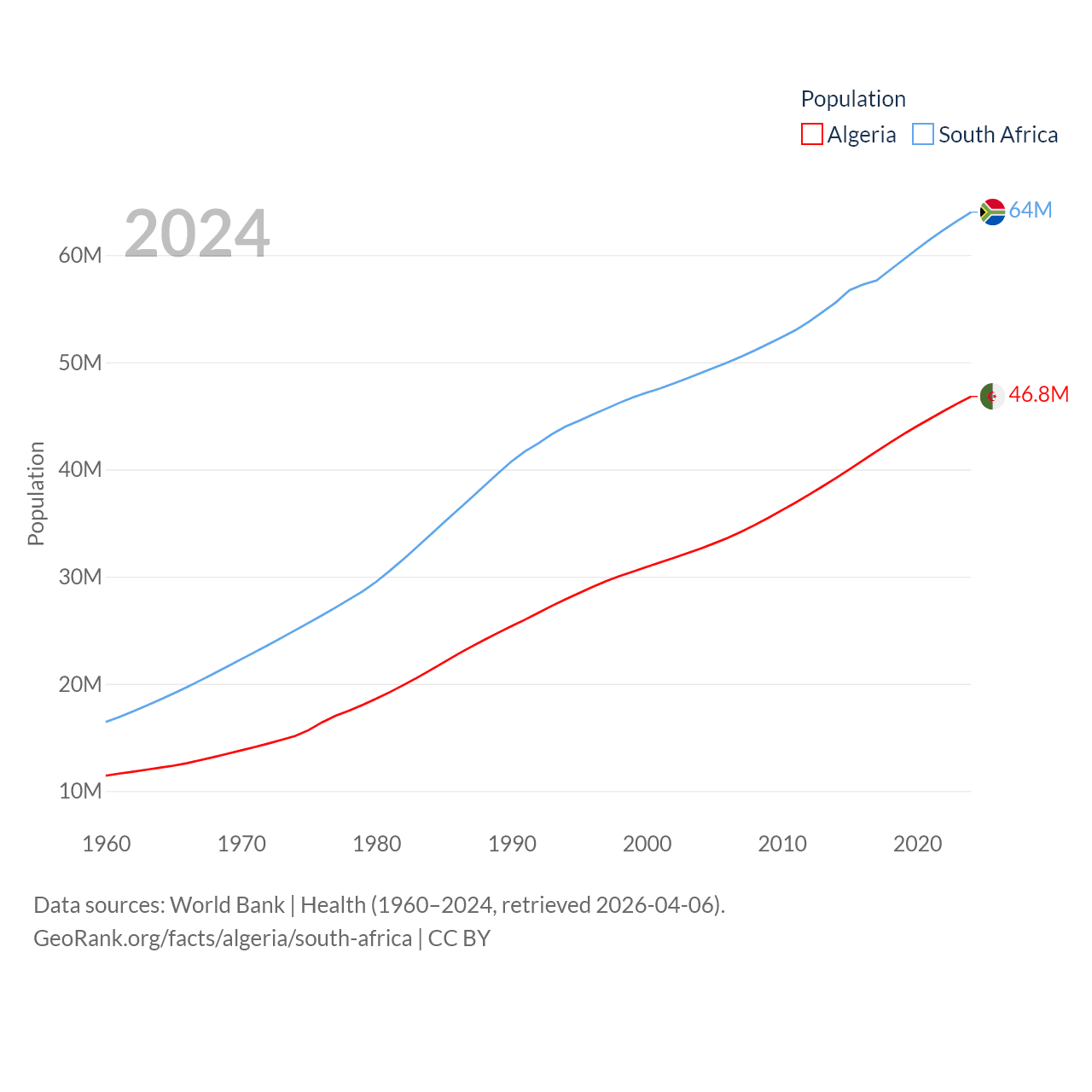 Algeria has a population of 46.8M (ranked 33/197), compared with 64M in South Africa (ranked 24/197). Algeria's land area is 919,595 sq mi versus 468,377 sq mi for South Africa (ranked 10th vs. 24th).