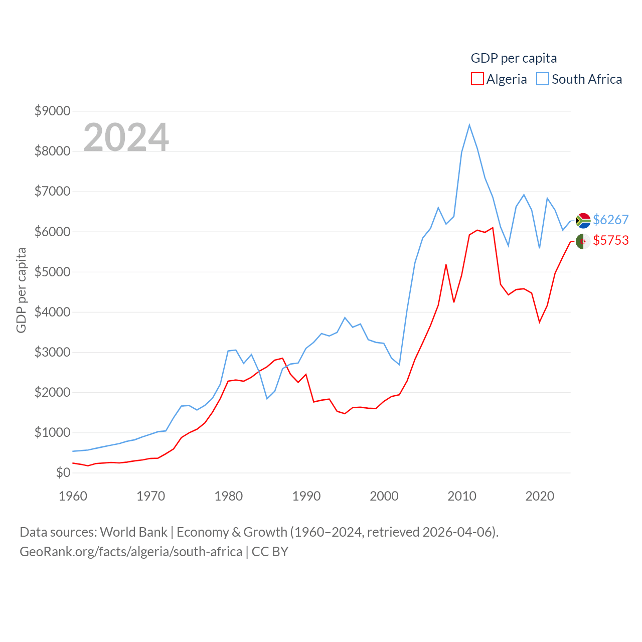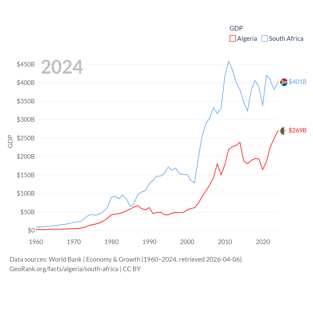 By GDP, Algeria ranks 51/197 ($269B) and South Africa ranks 40/197 ($401B). By GDP per capita, Algeria ranks 114/197 ($5,753), while South Africa ranks 111/197 ($6,267).