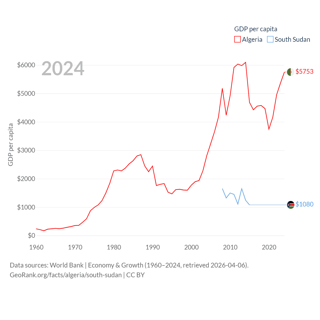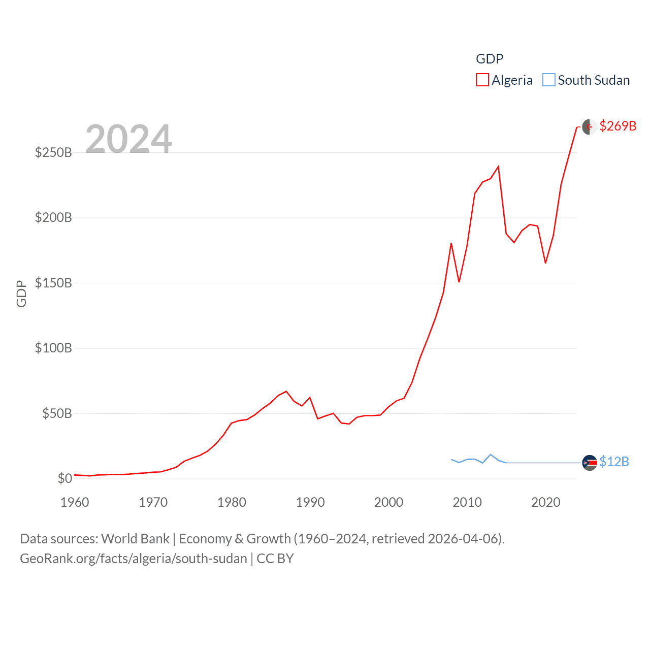 By GDP, Algeria ranks 51/197 ($269B) and South Sudan ranks 149/197 ($12B). By GDP per capita, Algeria ranks 114/197 ($5,753), while South Sudan ranks 175/197 ($1,080).