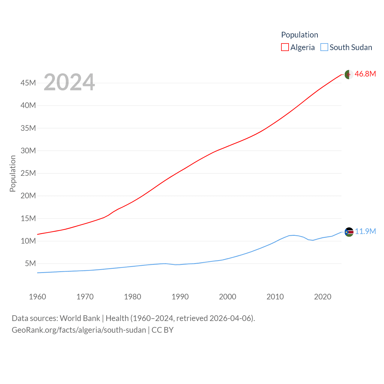 Algeria has a population of 46.8M (ranked 33/197), compared with 11.9M in South Sudan (ranked 81/197). Algeria's land area is 919,595 sq mi versus 243,990 sq mi for South Sudan (ranked 10th vs. 41st).