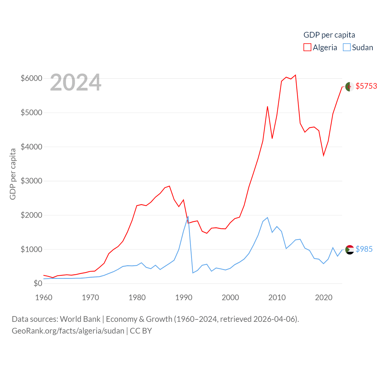 By GDP, Algeria ranks 51/197 ($269B) and Sudan ranks 94/197 ($49.7B). By GDP per capita, Algeria ranks 114/197 ($5,753), while Sudan ranks 179/197 ($985).