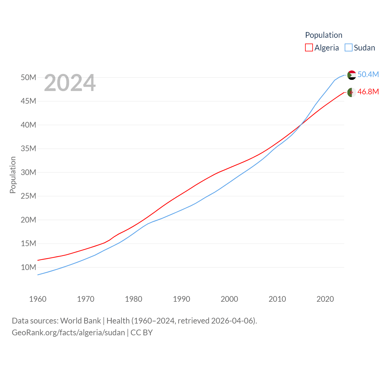 Algeria has a population of 46.8M (ranked 33/197), compared with 50.4M in Sudan (ranked 30/197). Algeria's land area is 919,595 sq mi versus 721,239 sq mi for Sudan (ranked 10th vs. 15th).