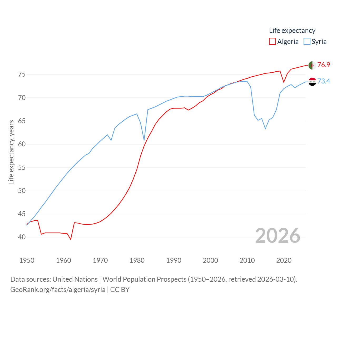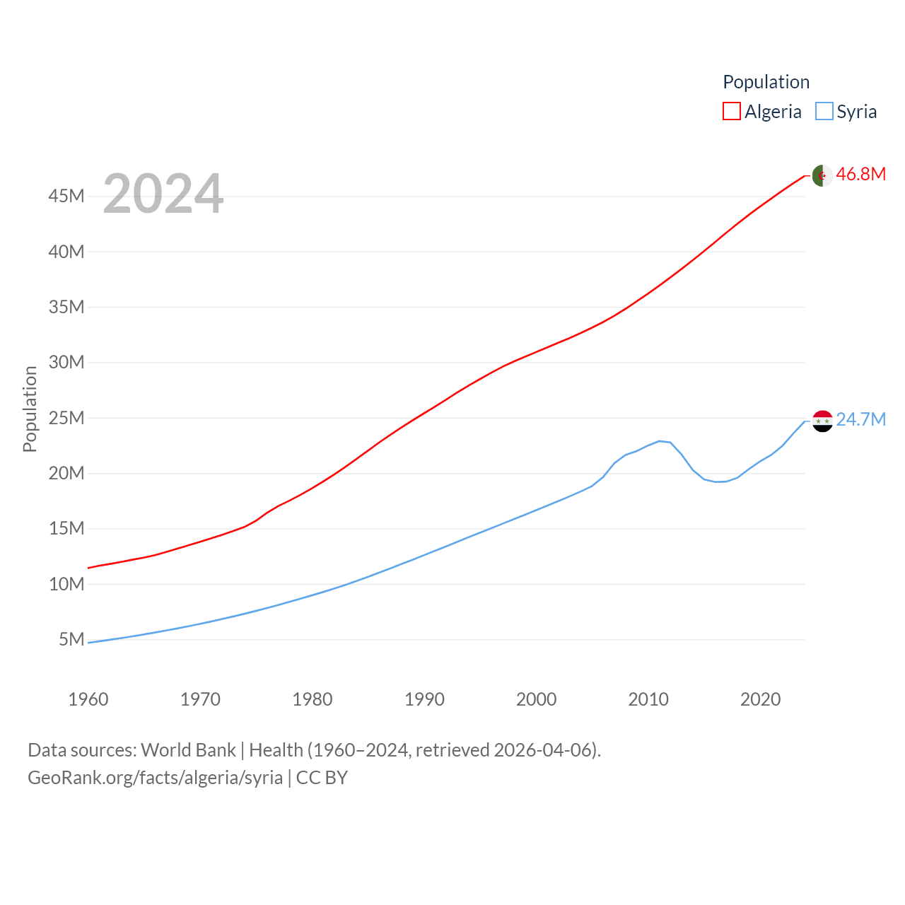 Algeria has a population of 46.8M (ranked 33/197), compared with 24.7M in Syria (ranked 57/197). Algeria's land area is 919,595 sq mi versus 70,900 sq mi for Syria (ranked 10th vs. 87th).