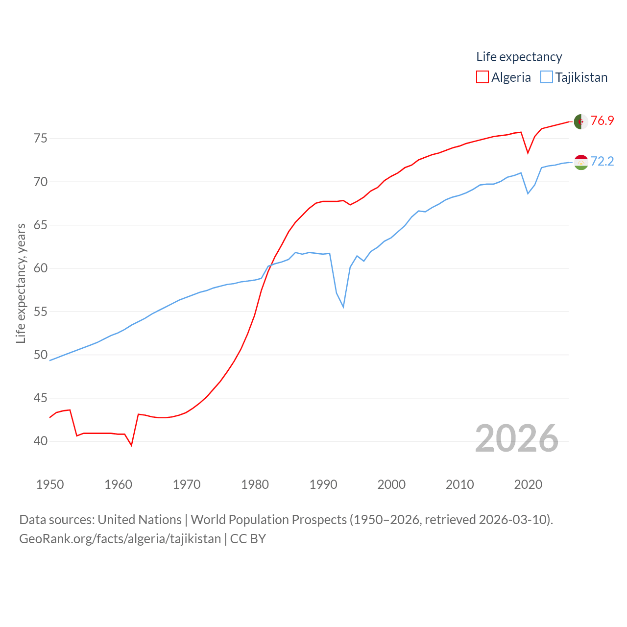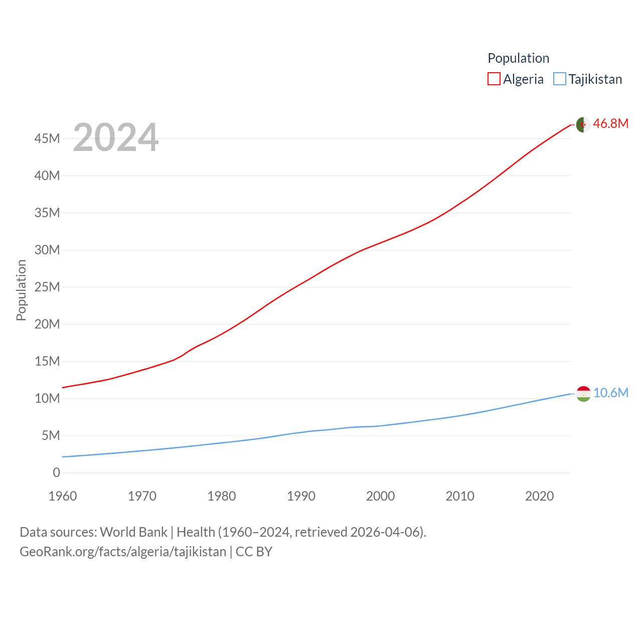 Algeria has a population of 46.8M (ranked 33/197), compared with 10.6M in Tajikistan (ranked 91/197). Algeria's land area is 919,595 sq mi versus 53,587 sq mi for Tajikistan (ranked 10th vs. 93rd).