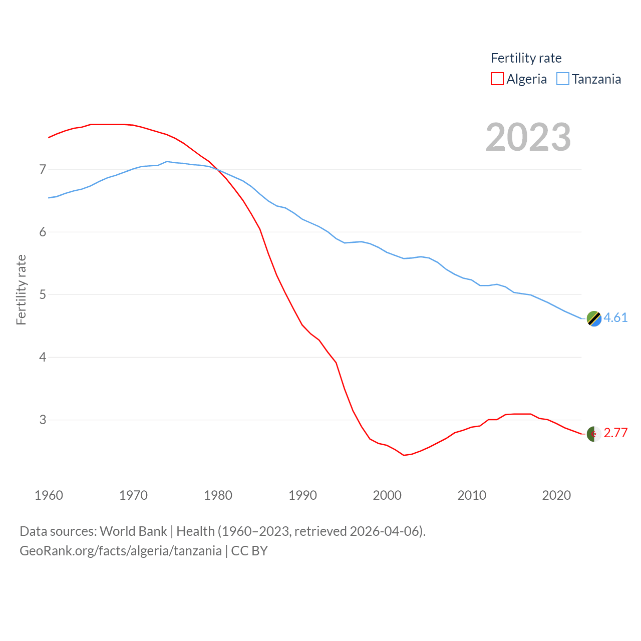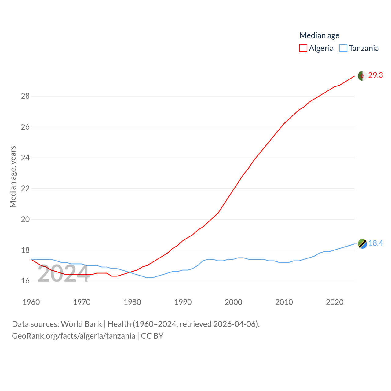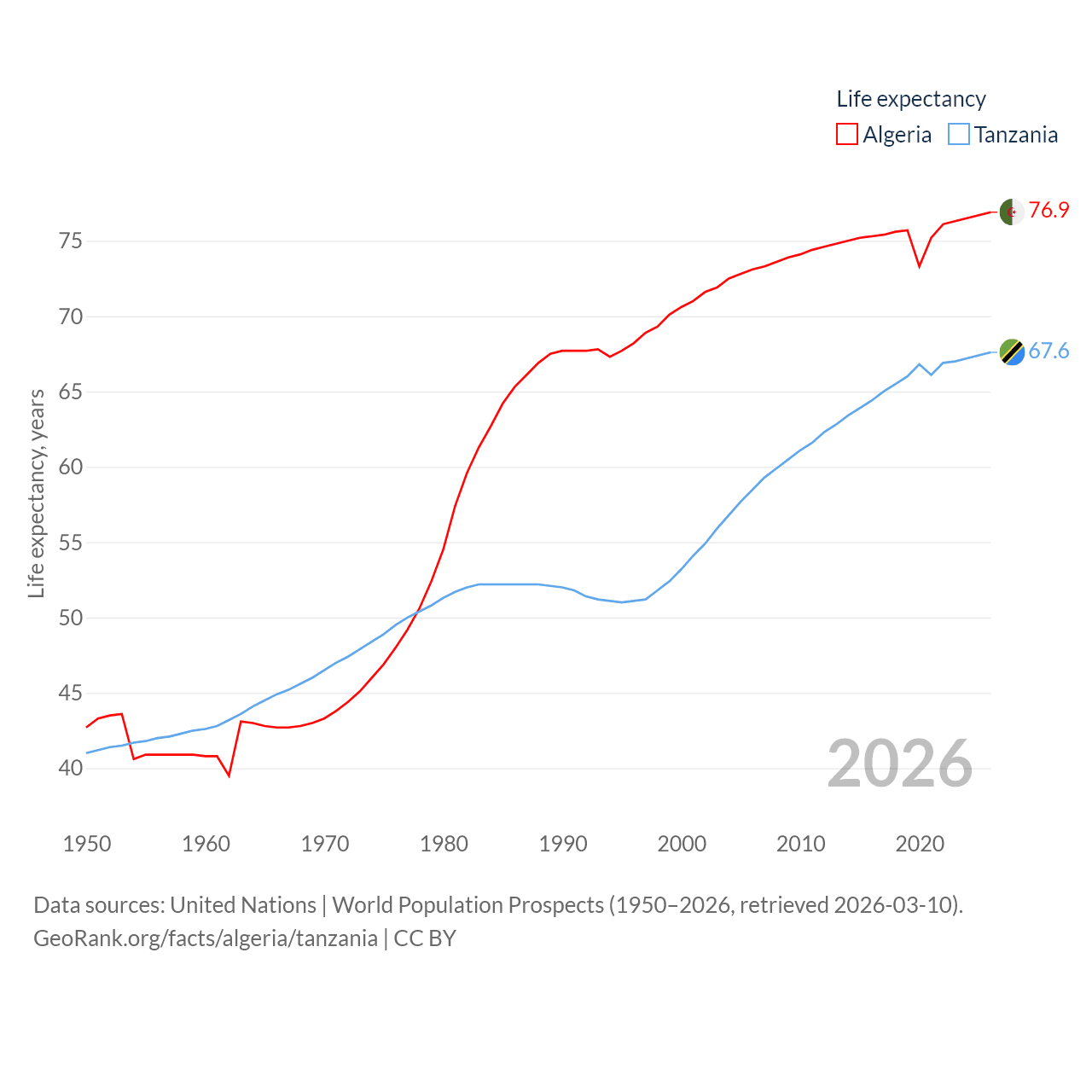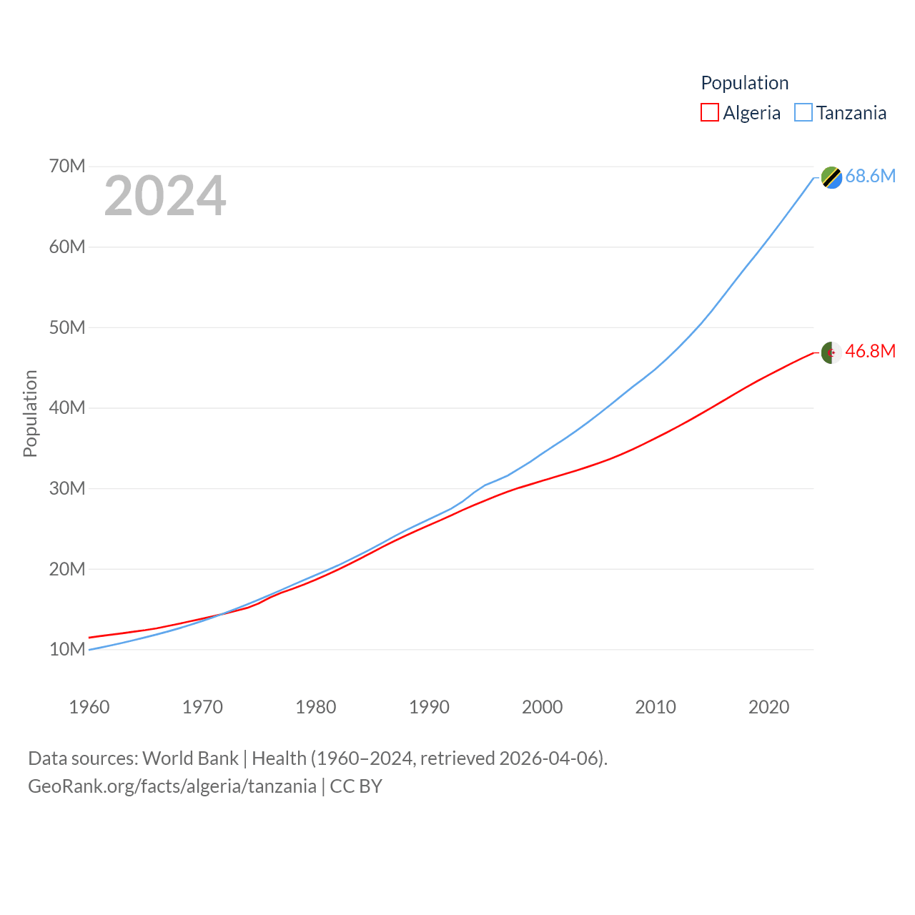 Algeria has a population of 46.8M (ranked 33/197), compared with 68.6M in Tanzania (ranked 22/197). Algeria's land area is 919,595 sq mi versus 342,009 sq mi for Tanzania (ranked 10th vs. 31st).