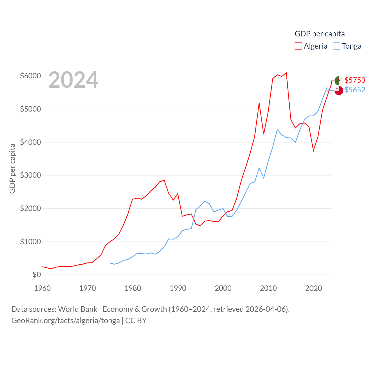 By GDP, Algeria ranks 51/197 ($269B) and Tonga ranks 191/197 ($591M). By GDP per capita, Algeria ranks 114/197 ($5,753), while Tonga ranks 115/197 ($5,652).