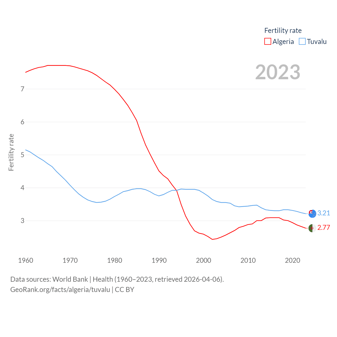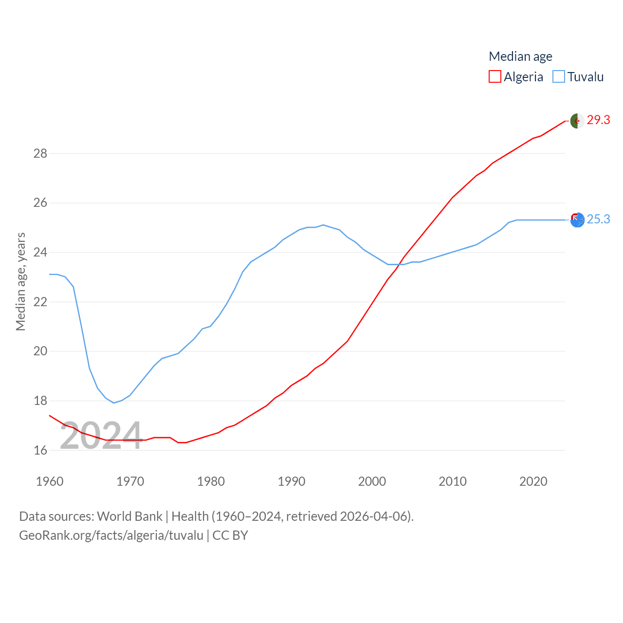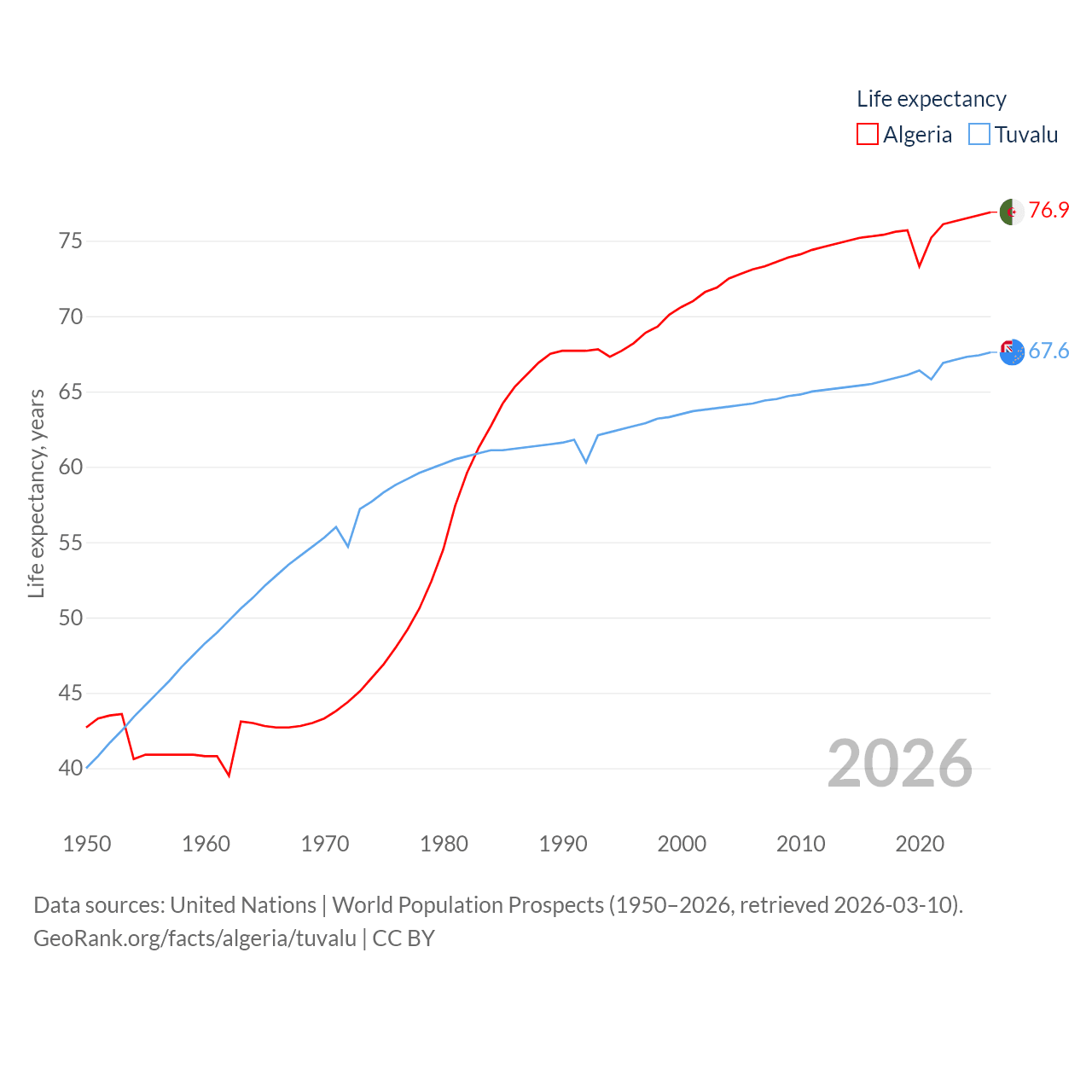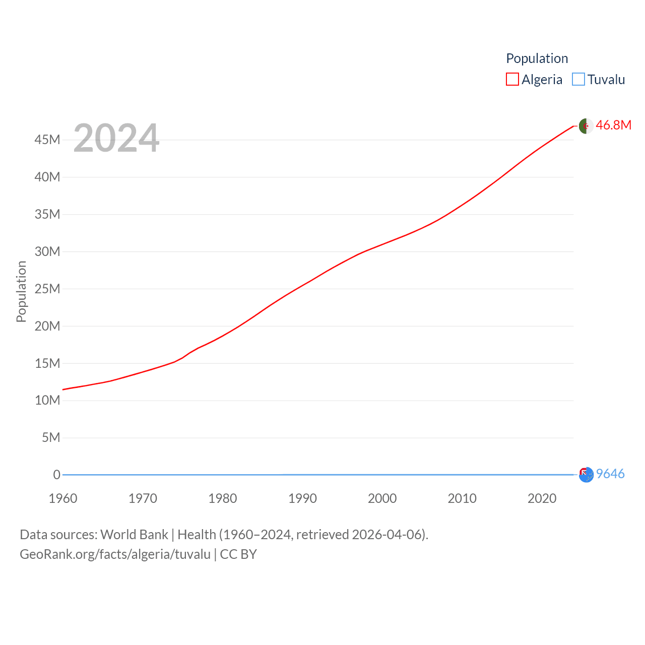 Algeria has a population of 46.8M (ranked 33/197), compared with 9.65K in Tuvalu (ranked 196/197). Algeria's land area is 919,595 sq mi versus 11.6 sq mi for Tuvalu (ranked 10th vs. 194th).