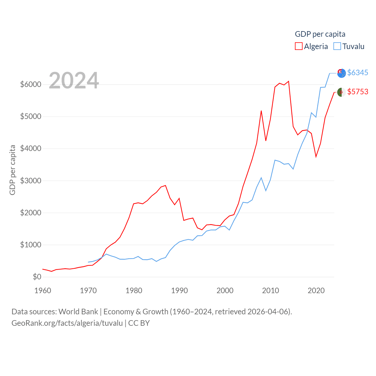 By GDP, Algeria ranks 51/197 ($269B) and Tuvalu ranks 196/197 ($62.3M). By GDP per capita, Algeria ranks 114/197 ($5,753), while Tuvalu ranks 110/197 ($6,345).