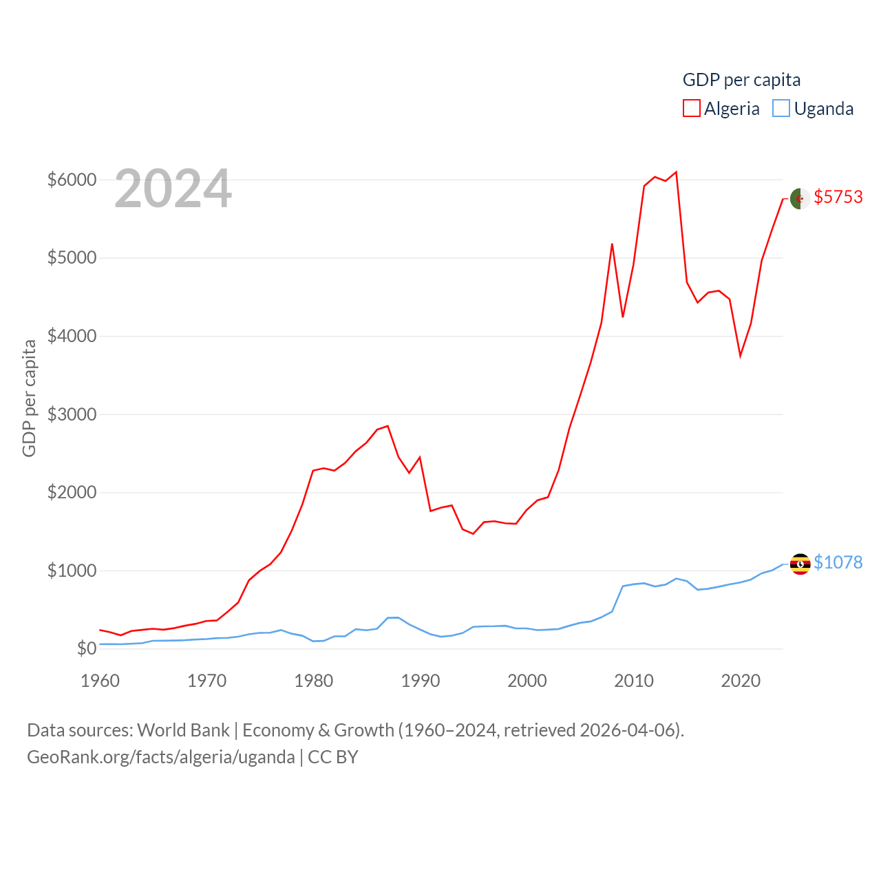 By GDP, Algeria ranks 51/197 ($269B) and Uganda ranks 89/197 ($53.9B). By GDP per capita, Algeria ranks 114/197 ($5,753), while Uganda ranks 176/197 ($1,078).