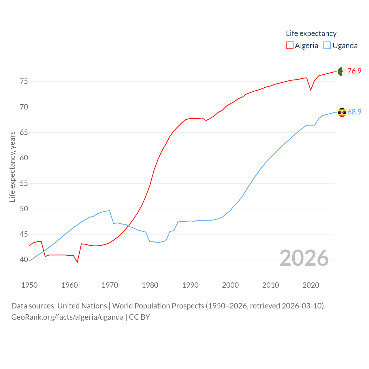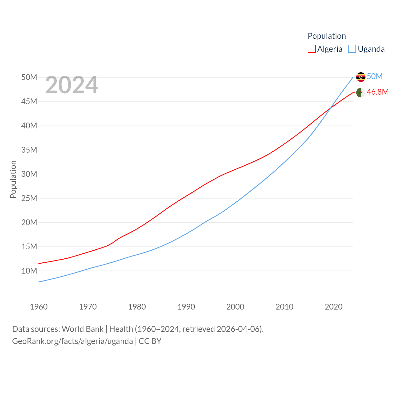 Algeria has a population of 46.8M (ranked 33/197), compared with 50M in Uganda (ranked 31/197). Algeria's land area is 919,595 sq mi versus 77,421 sq mi for Uganda (ranked 10th vs. 84th).