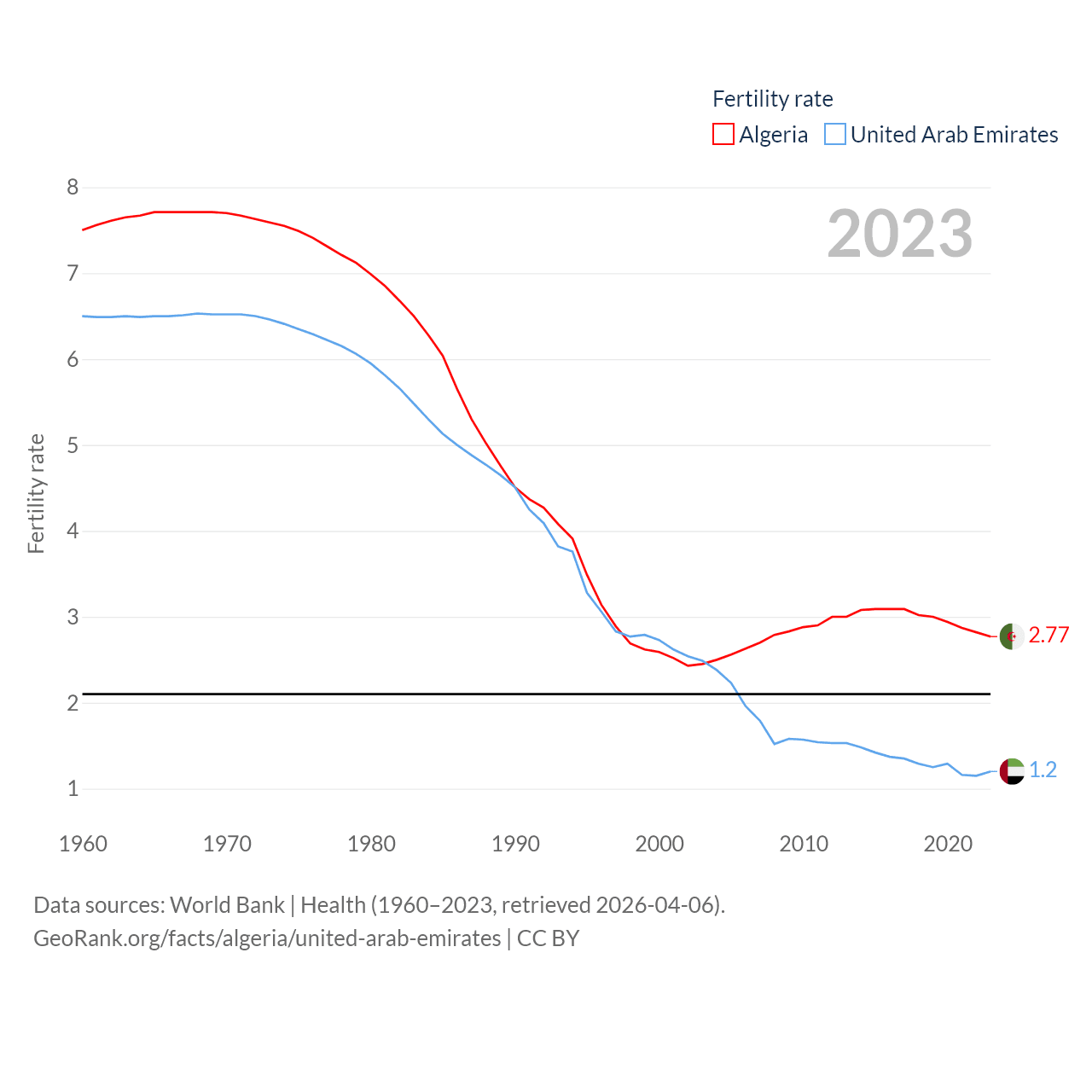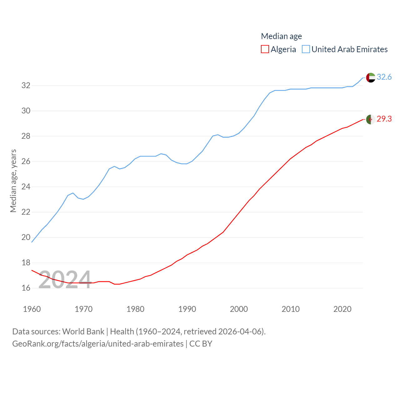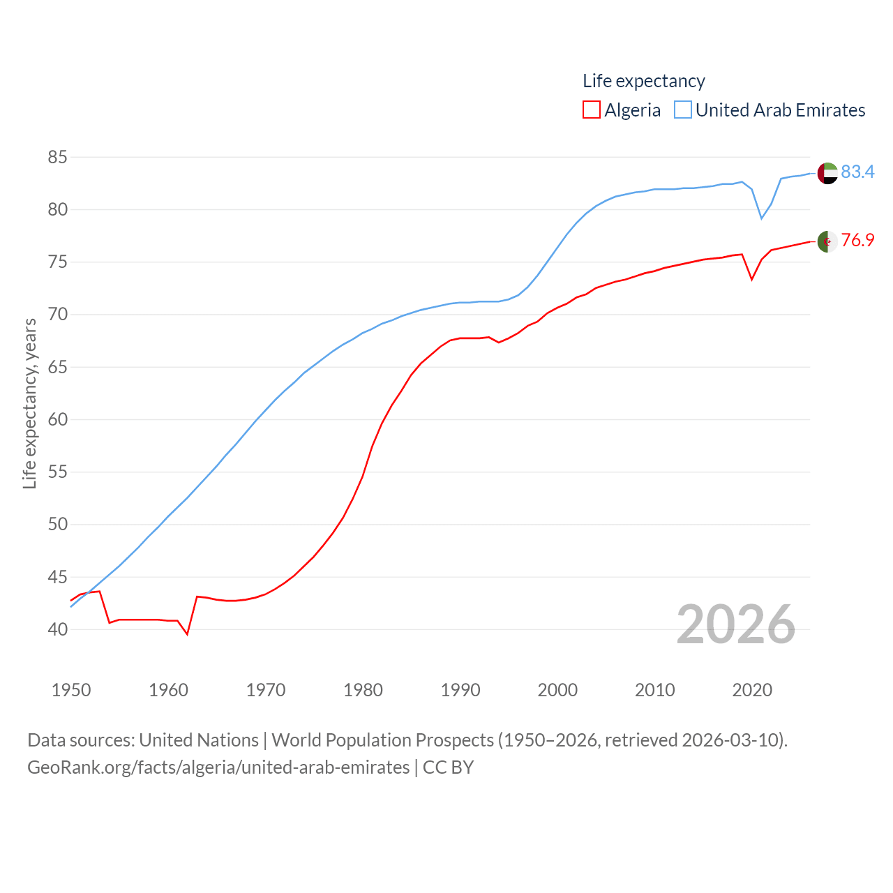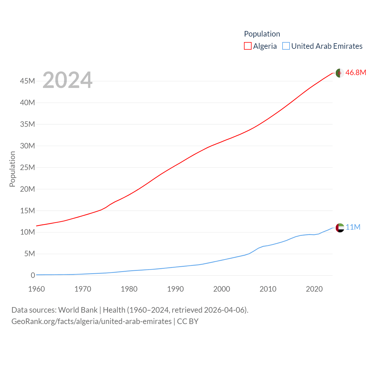 Algeria has a population of 46.8M (ranked 33/197), compared with 11M in The United Arab Emirates (ranked 86/197). Algeria's land area is 919,595 sq mi versus 27,421 sq mi for The United Arab Emirates (ranked 10th vs. 117th).