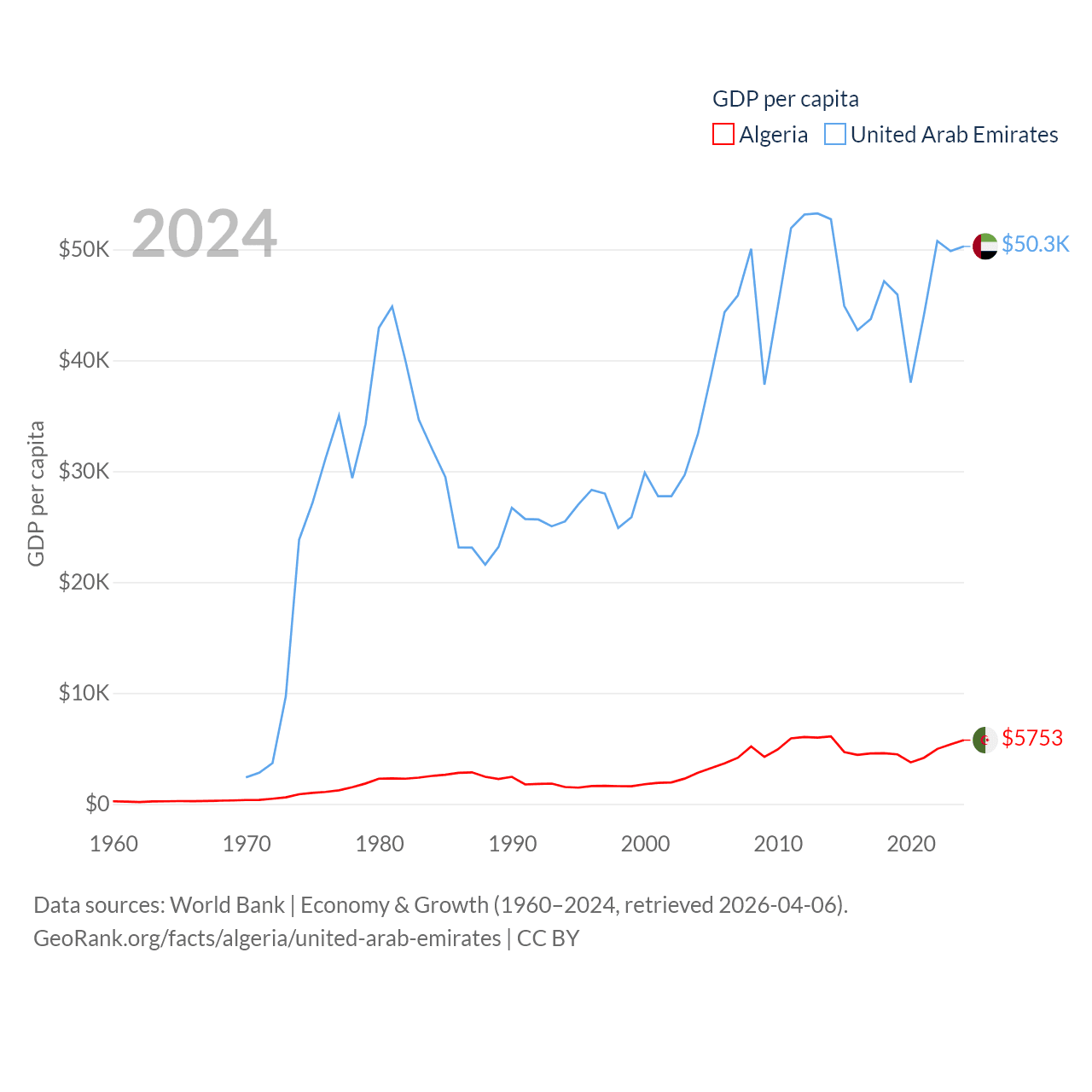 By GDP, Algeria ranks 51/197 ($269B) and The United Arab Emirates ranks 27/197 ($552B). By GDP per capita, Algeria ranks 114/197 ($5,753), while The United Arab Emirates ranks 24/197 ($50,274).