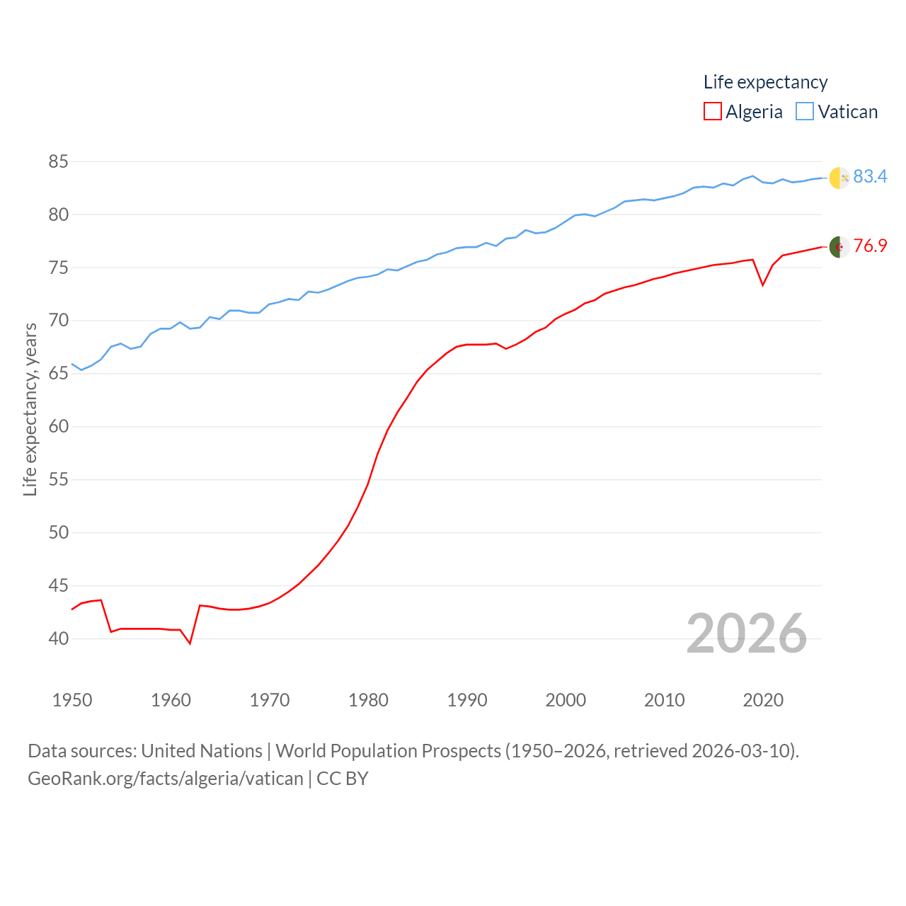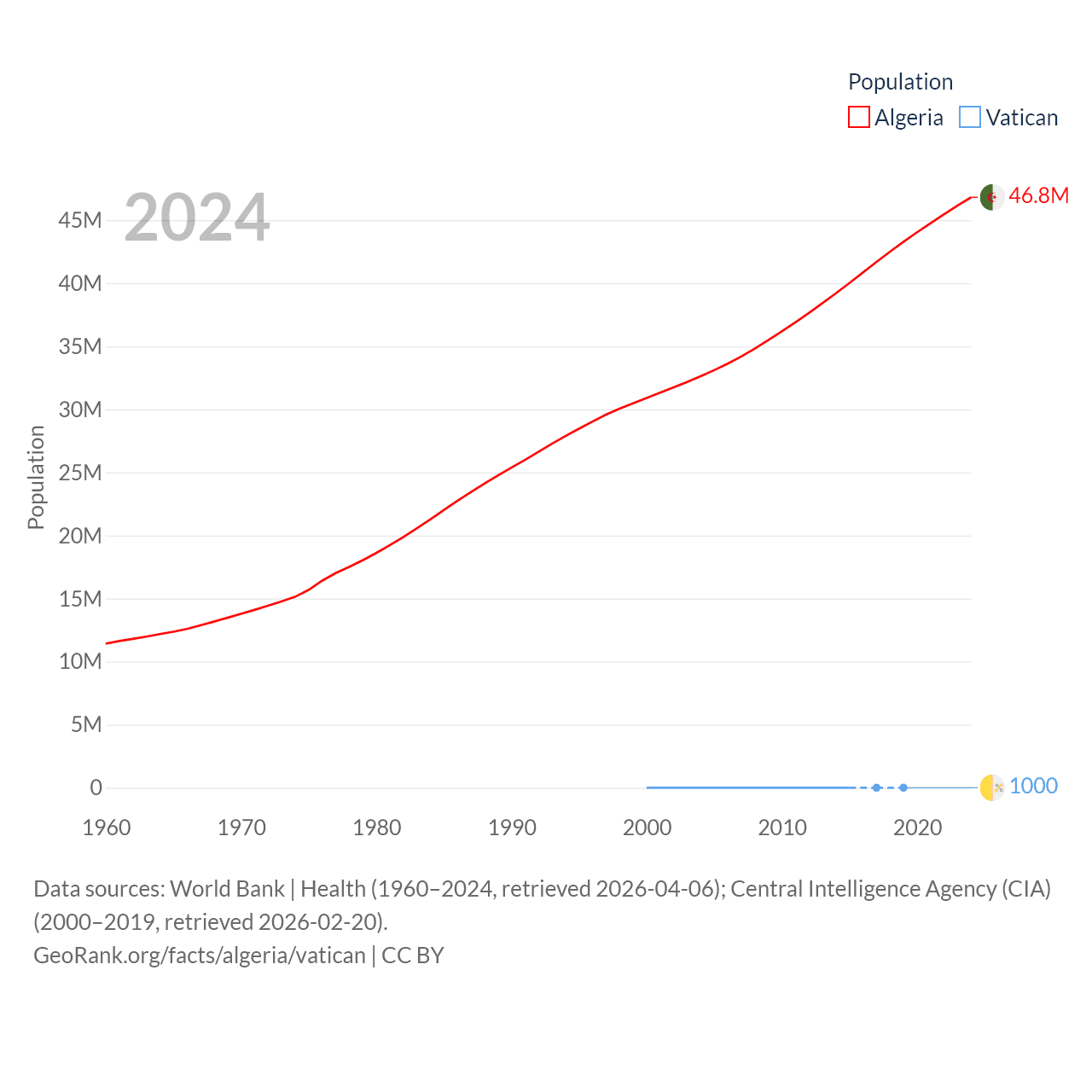 Algeria has a population of 46.8M (ranked 33/197), compared with 1K in The Vatican (ranked 197/197). Algeria's land area is 919,595 sq mi versus 0.17 sq mi for The Vatican (ranked 10th vs. 197th).
