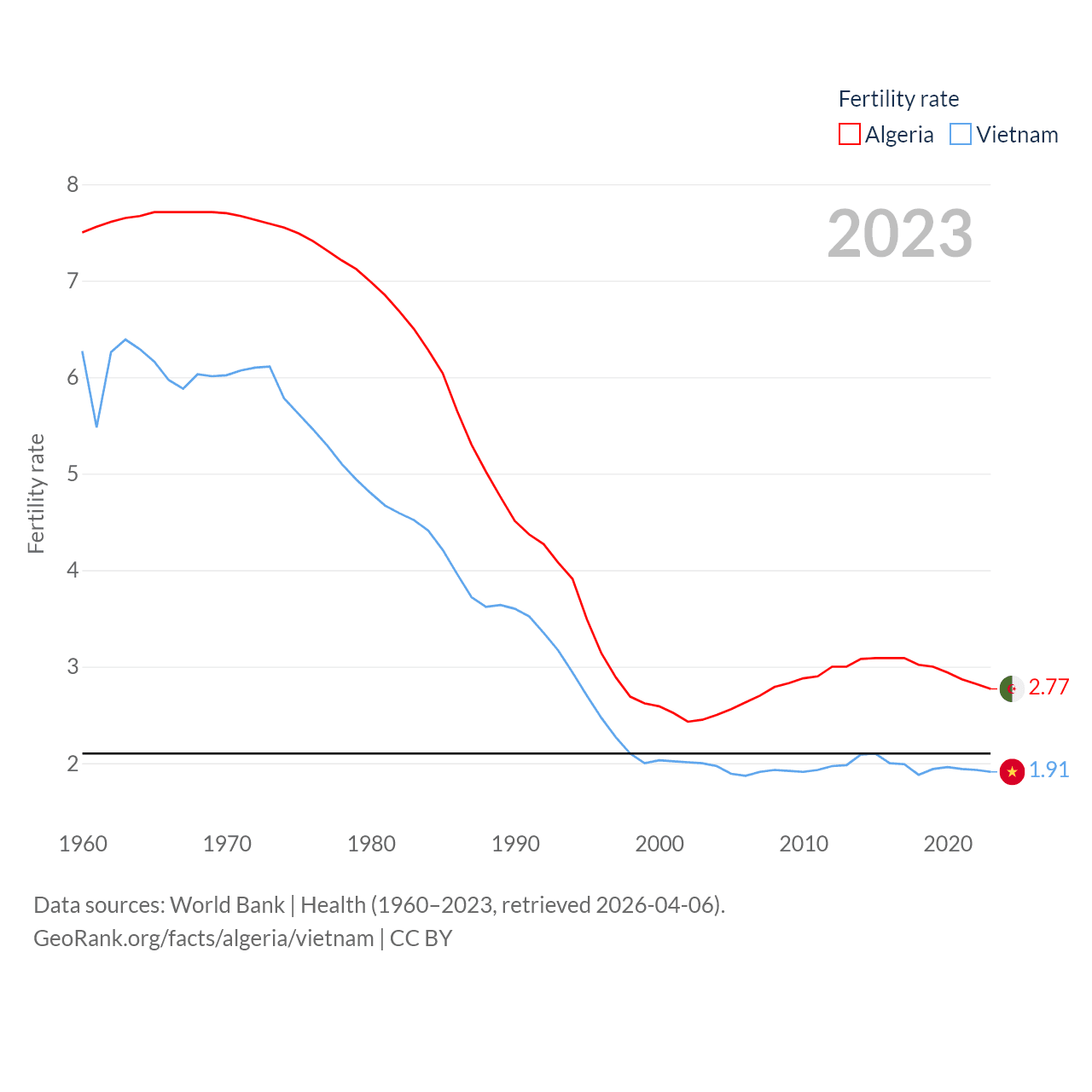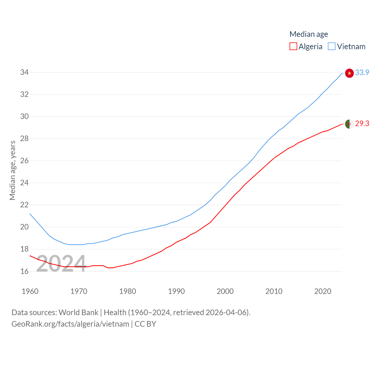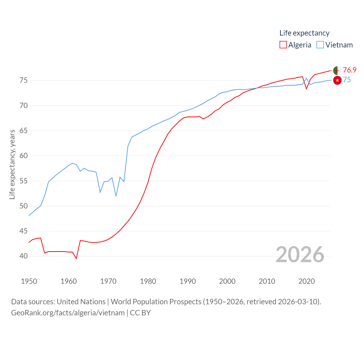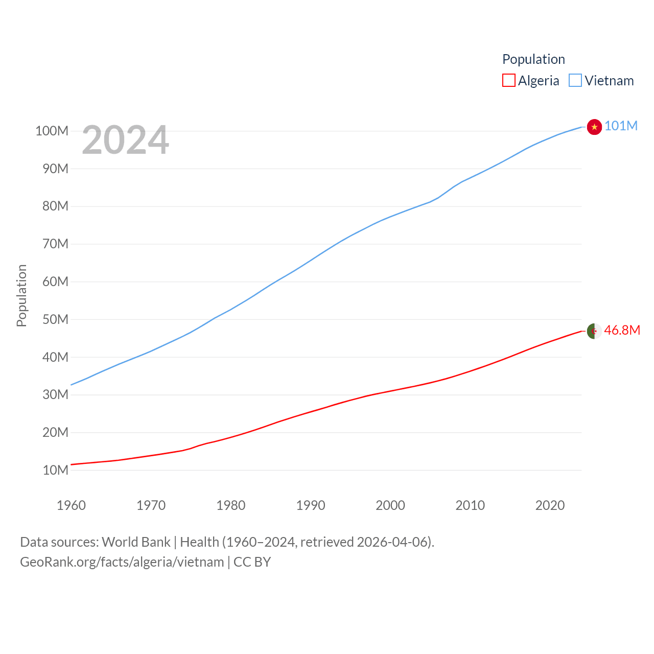 Algeria has a population of 46.8M (ranked 33/197), compared with 101M in Vietnam (ranked 16/197). Algeria's land area is 919,595 sq mi versus 121,016 sq mi for Vietnam (ranked 10th vs. 67th).