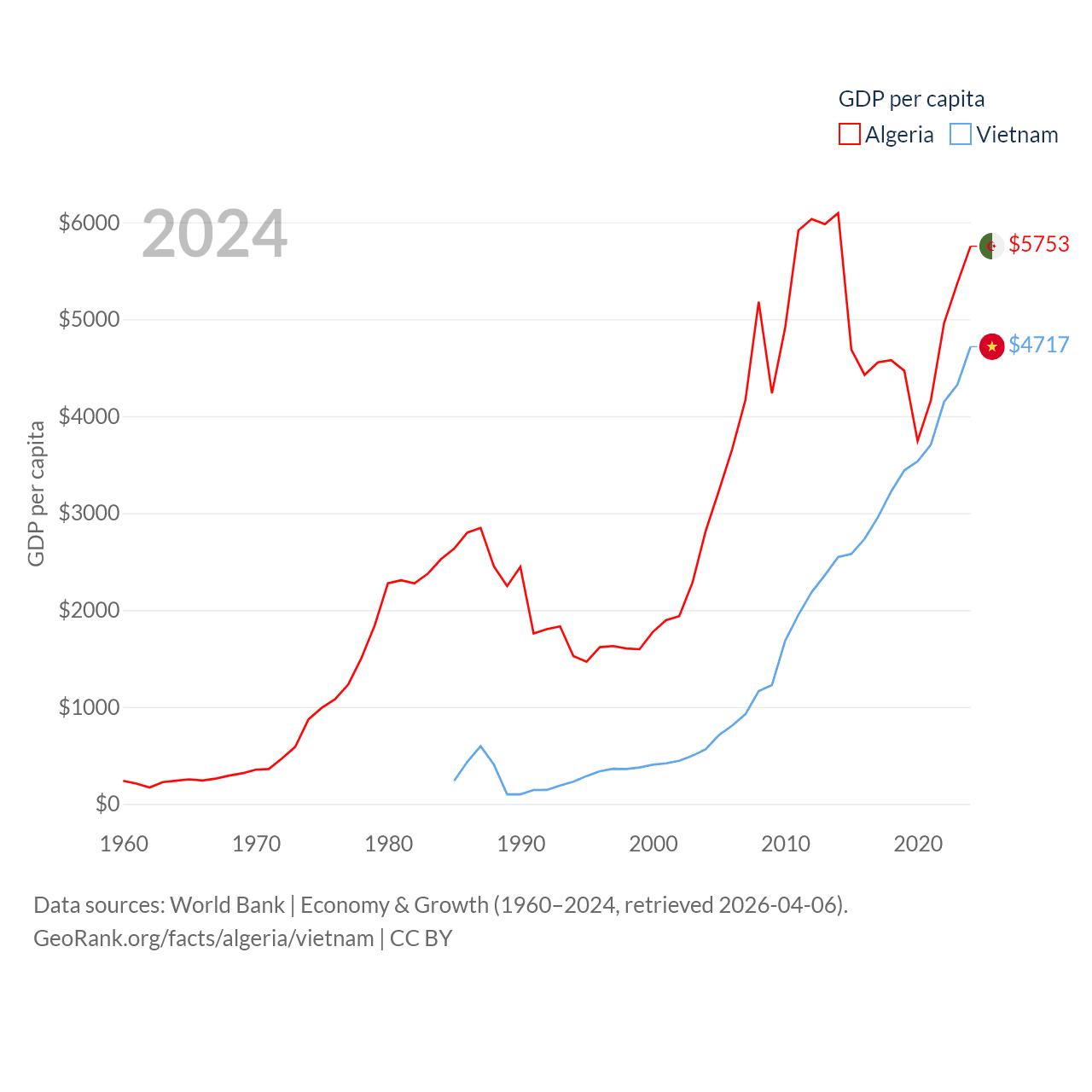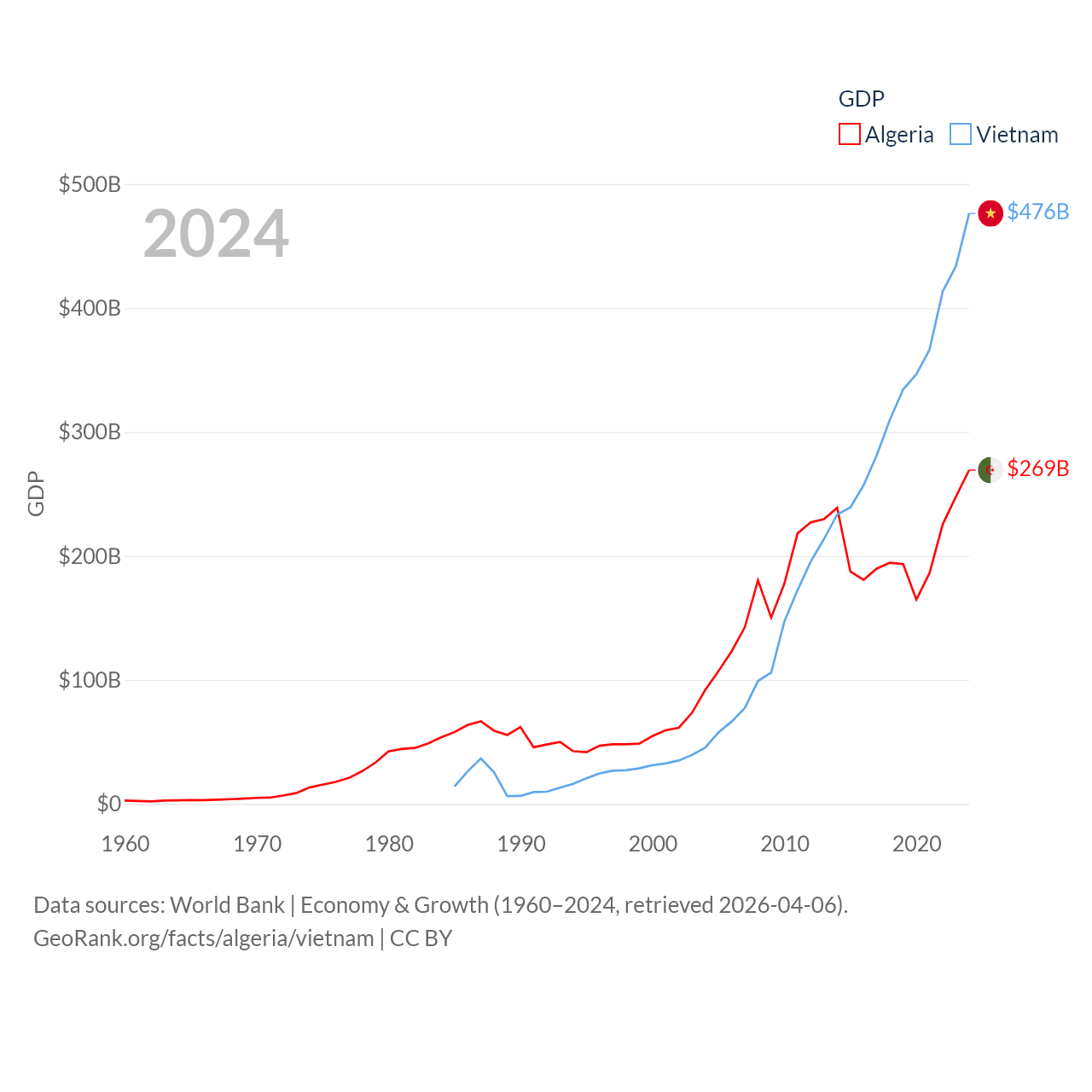 By GDP, Algeria ranks 51/197 ($269B) and Vietnam ranks 33/197 ($476B). By GDP per capita, Algeria ranks 114/197 ($5,753), while Vietnam ranks 122/197 ($4,717).