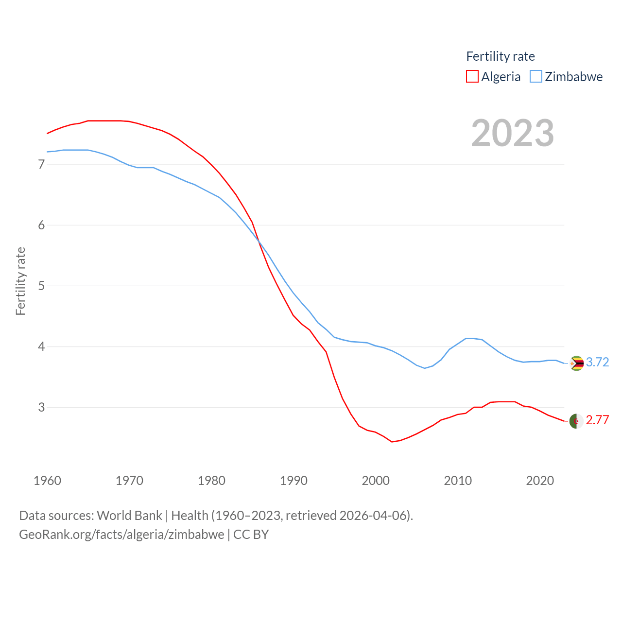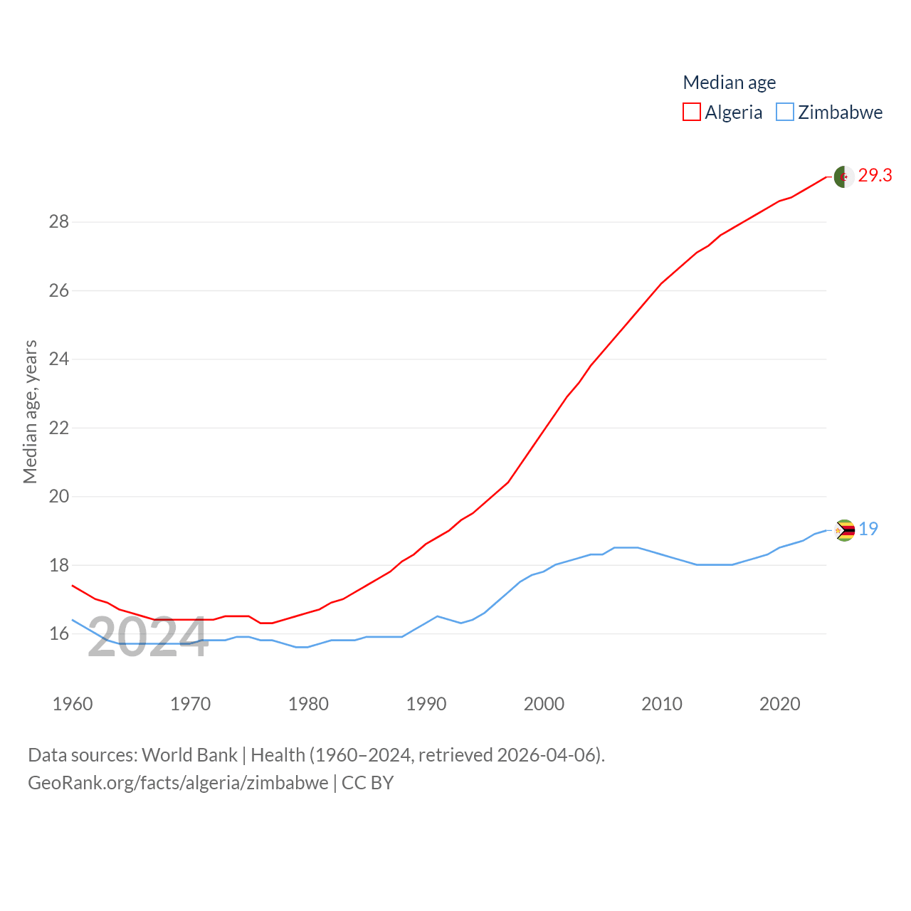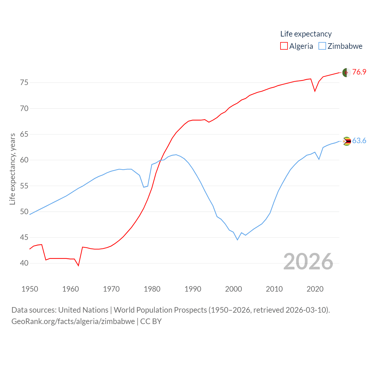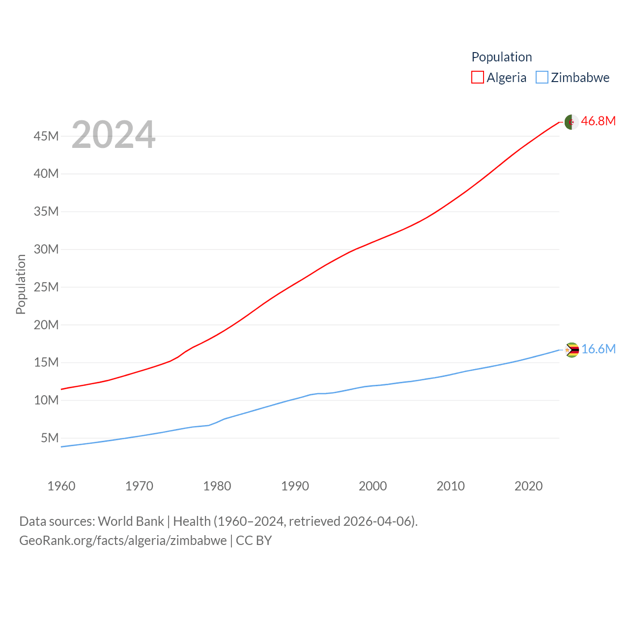 Algeria has a population of 46.8M (ranked 33/197), compared with 16.6M in Zimbabwe (ranked 74/197). Algeria's land area is 919,595 sq mi versus 149,364 sq mi for Zimbabwe (ranked 10th vs. 60th).