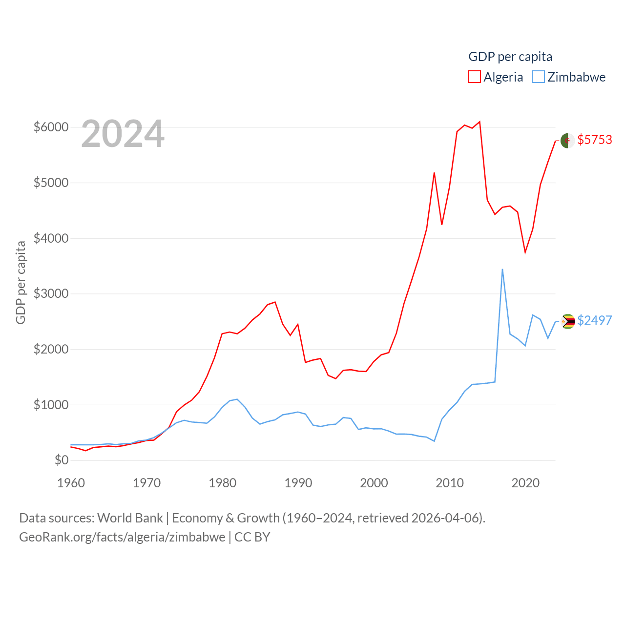 By GDP, Algeria ranks 51/197 ($269B) and Zimbabwe ranks 102/197 ($41.5B). By GDP per capita, Algeria ranks 114/197 ($5,753), while Zimbabwe ranks 148/197 ($2,497).