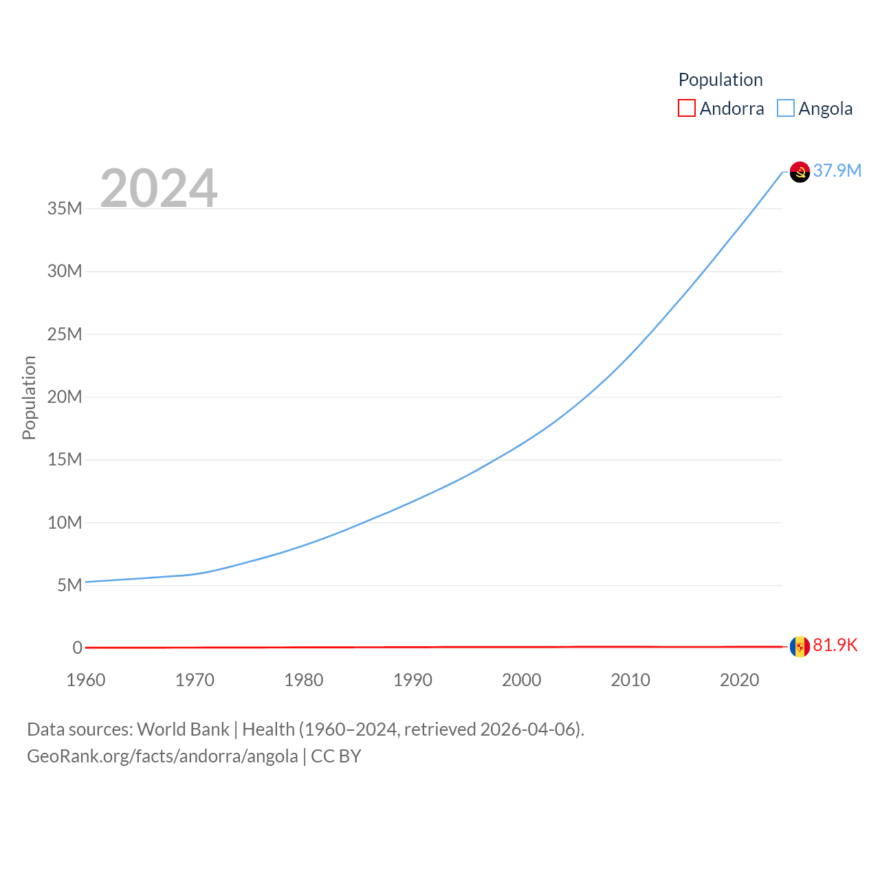 Andorra has a population of 81.9K (ranked 186/197), compared with 37.9M in Angola (ranked 40/197). Andorra's land area is 181.5 sq mi versus 481,354 sq mi for Angola (ranked 179th vs. 22nd).