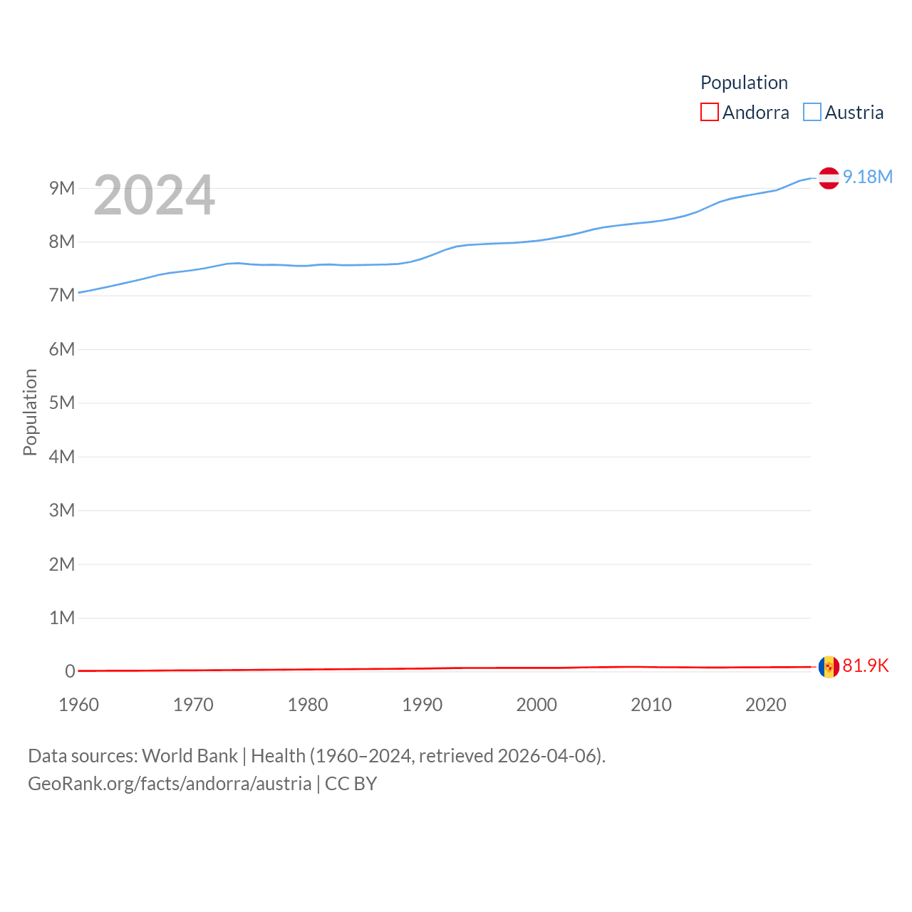 Andorra has a population of 81.9K (ranked 186/197), compared with 9.18M in Austria (ranked 99/197). Andorra's land area is 181.5 sq mi versus 31,861 sq mi for Austria (ranked 179th vs. 113th).