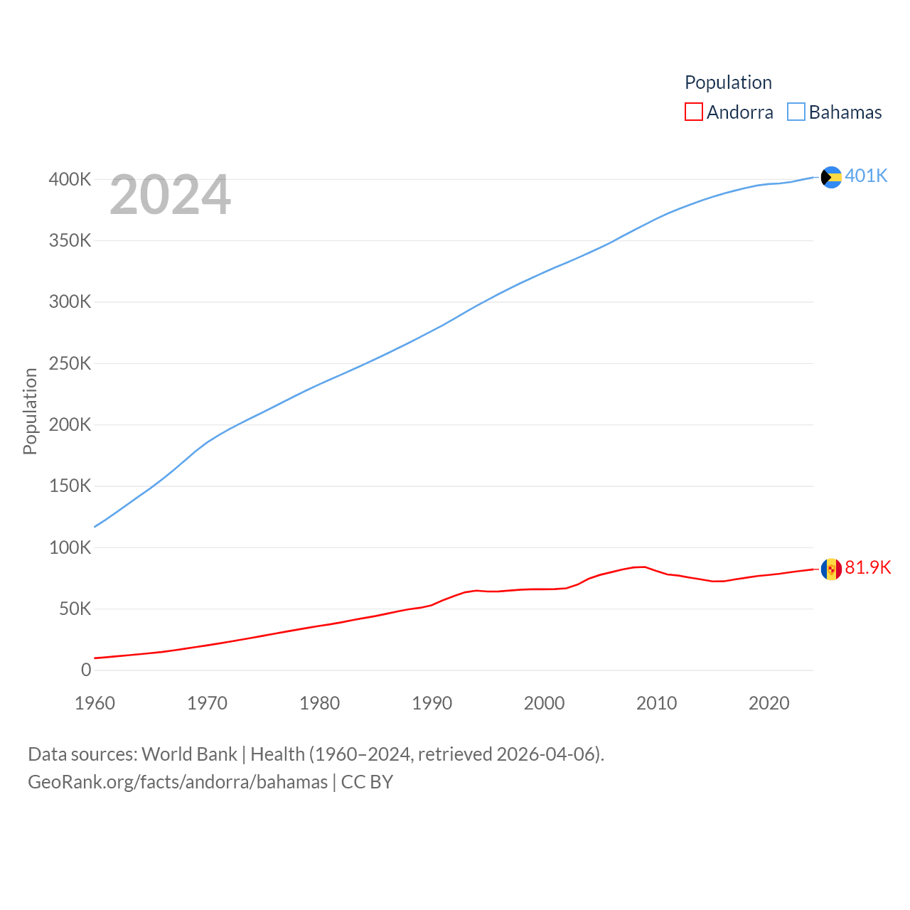 Andorra has a population of 81.9K (ranked 186/197), compared with 401K in The Bahamas (ranked 172/197). Andorra's land area is 181.5 sq mi versus 3,865 sq mi for The Bahamas (ranked 179th vs. 162nd).