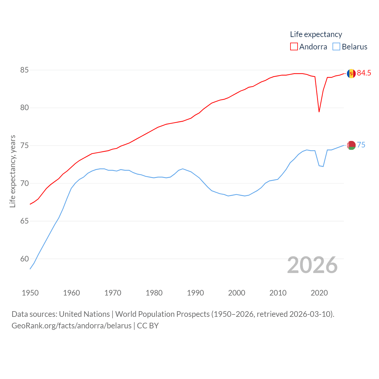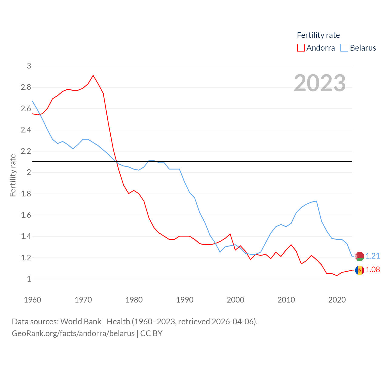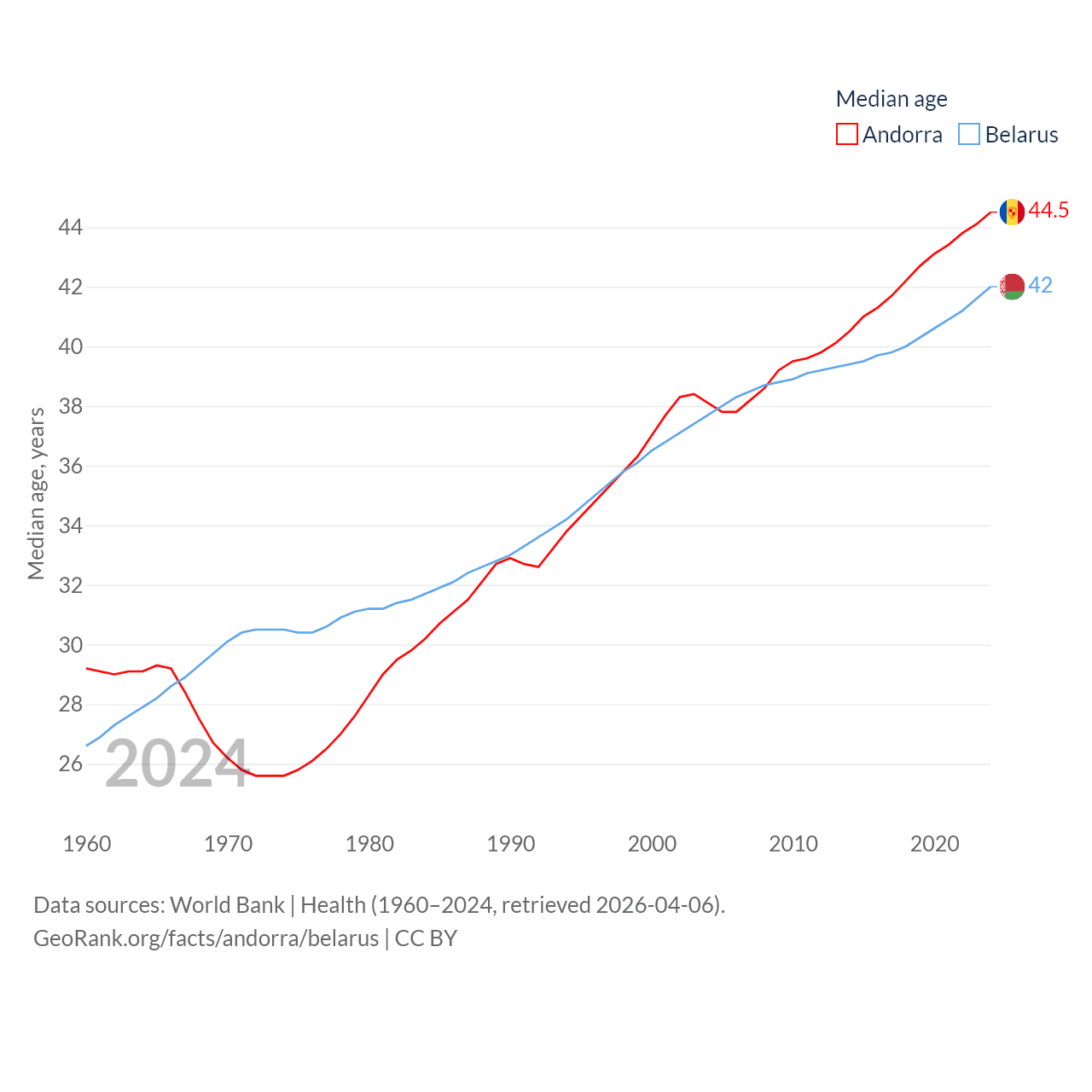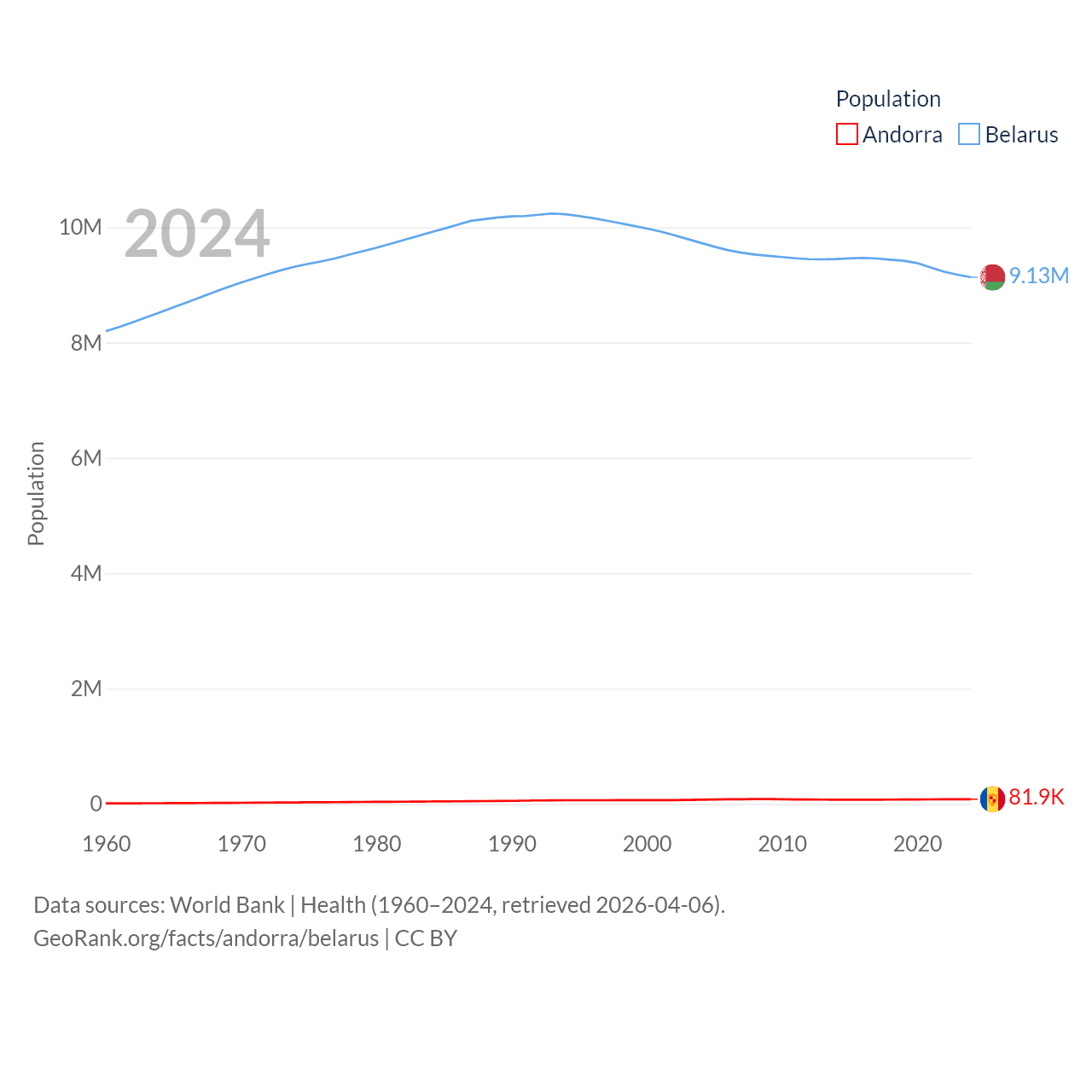 Andorra has a population of 81.9K (ranked 186/197), compared with 9.13M in Belarus (ranked 100/197). Andorra's land area is 181.5 sq mi versus 78,372 sq mi for Belarus (ranked 179th vs. 83rd).