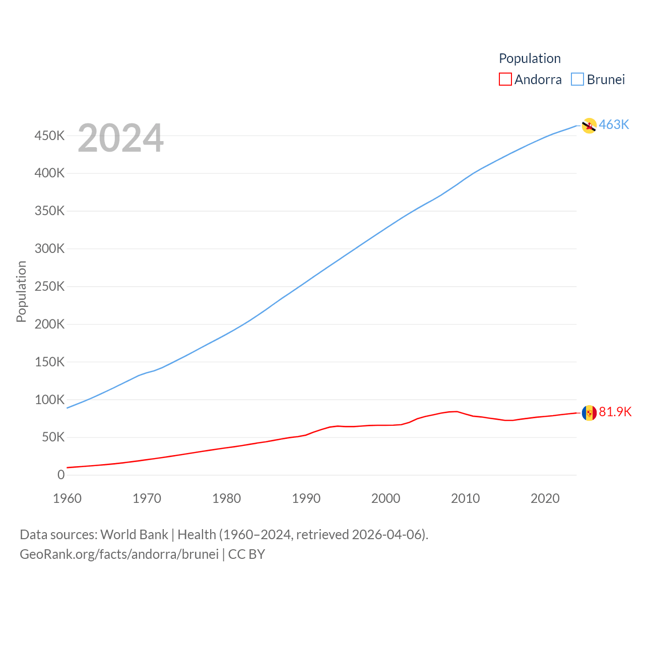 Andorra has a population of 81.9K (ranked 186/197), compared with 463K in Brunei (ranked 170/197). Andorra's land area is 181.5 sq mi versus 2,035 sq mi for Brunei (ranked 179th vs. 165th).