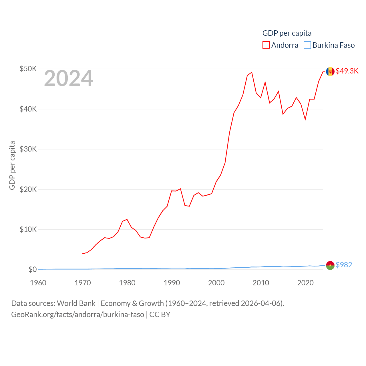 By GDP, Andorra ranks 166/197 ($4.04B) and Burkina Faso ranks 122/197 ($23.1B). By GDP per capita, Andorra ranks 25/197 ($49,304), while Burkina Faso ranks 180/197 ($982).