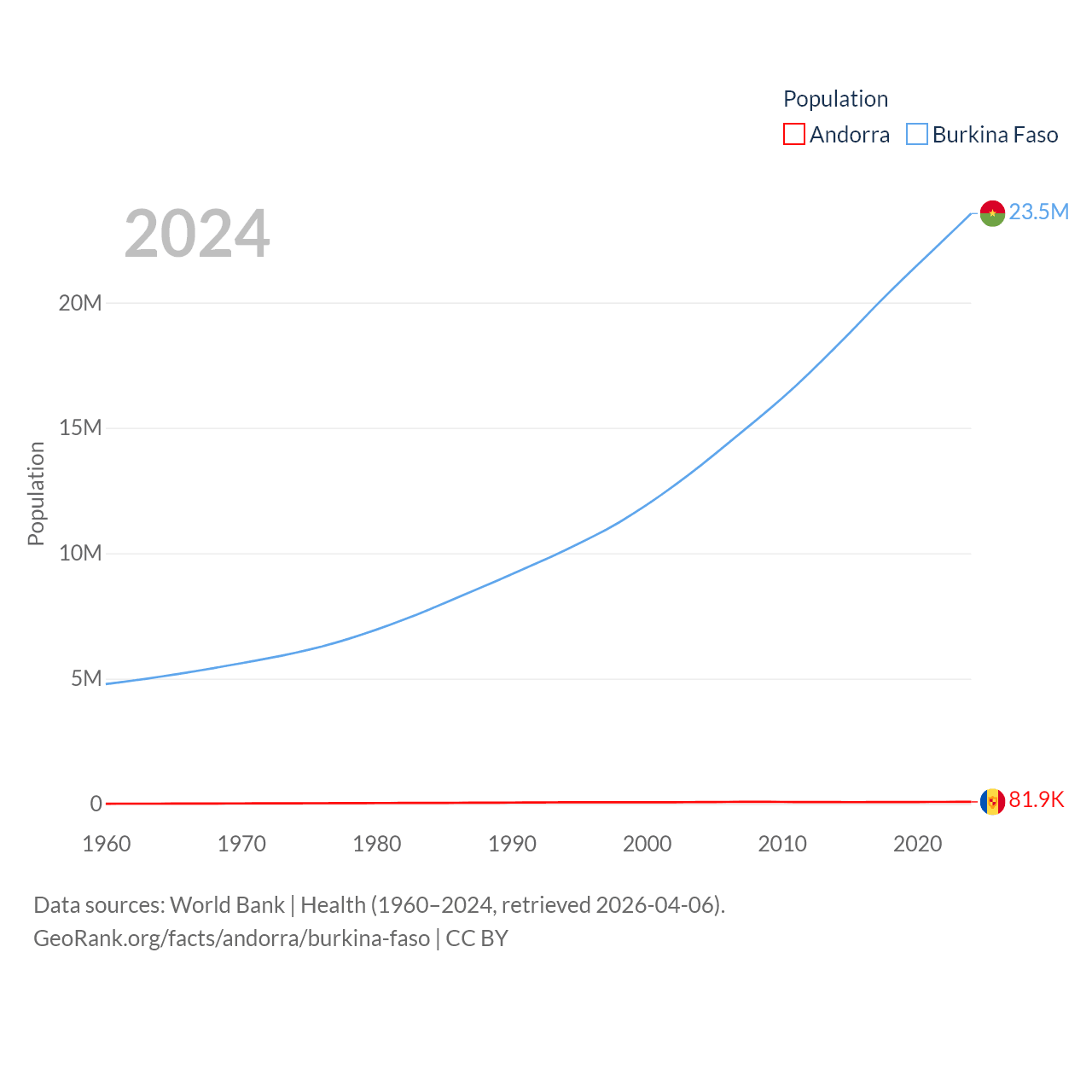 Andorra has a population of 81.9K (ranked 186/197), compared with 23.5M in Burkina Faso (ranked 59/197). Andorra's land area is 181.5 sq mi versus 105,638 sq mi for Burkina Faso (ranked 179th vs. 73rd).