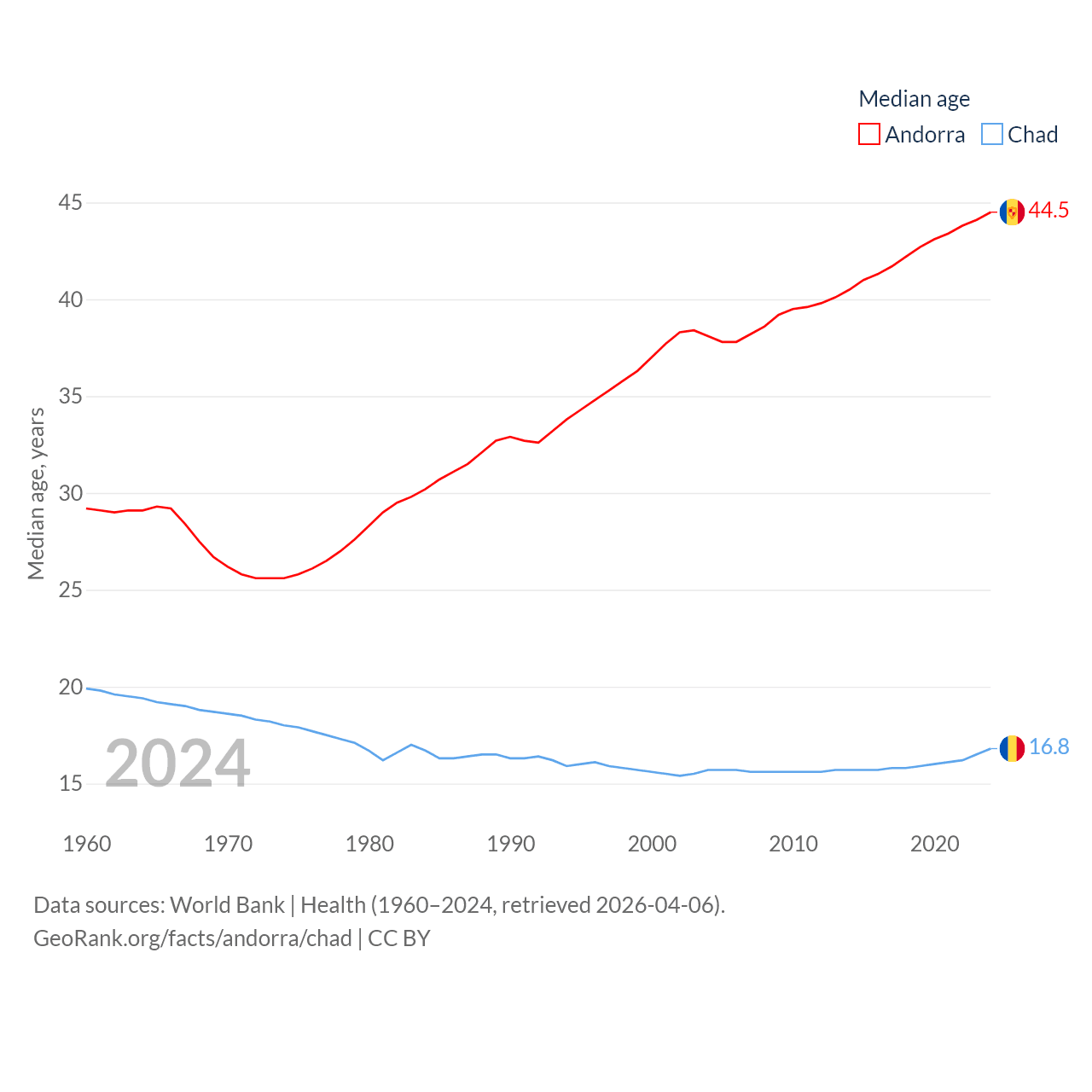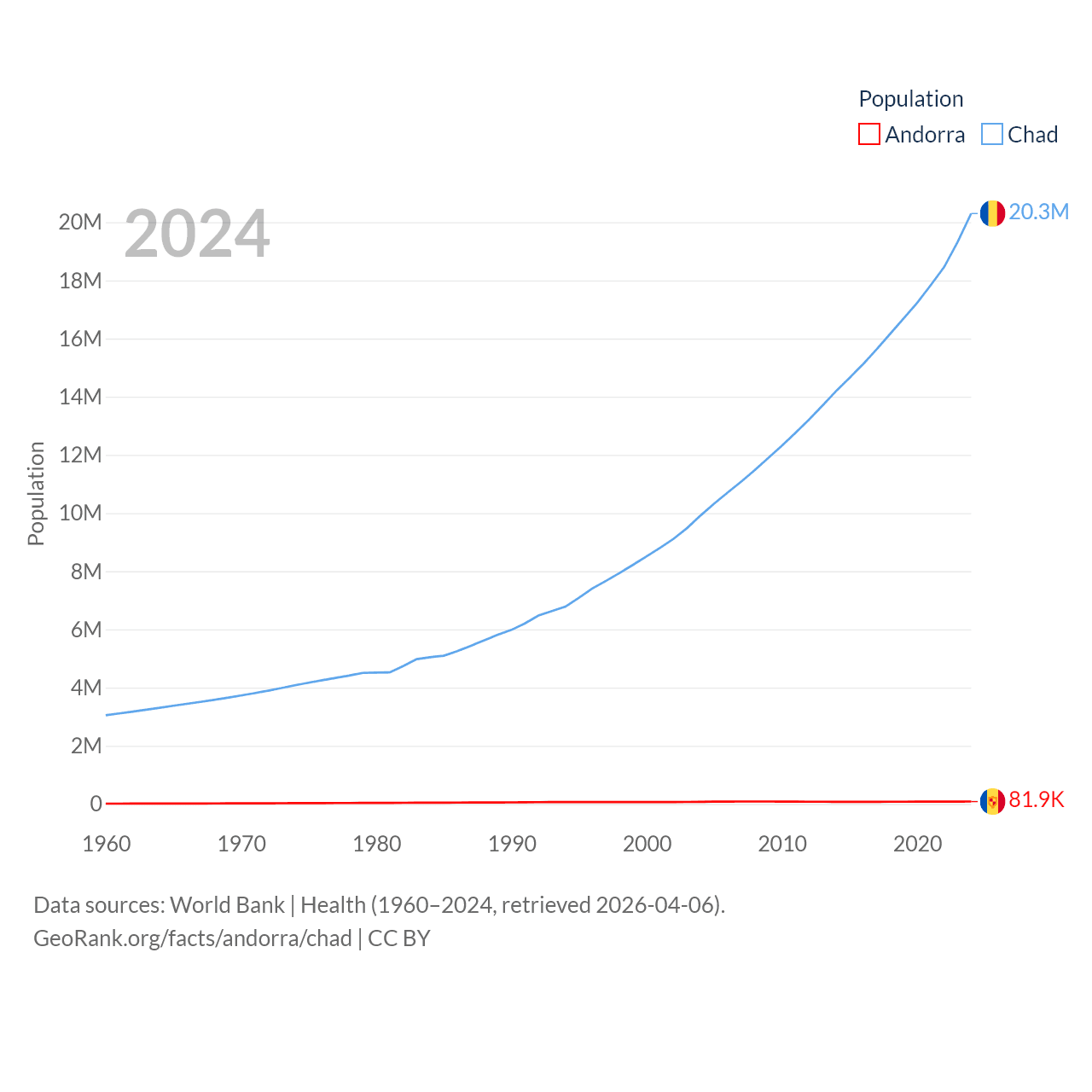 Andorra has a population of 81.9K (ranked 186/197), compared with 20.3M in Chad (ranked 65/197). Andorra's land area is 181.5 sq mi versus 486,180 sq mi for Chad (ranked 179th vs. 21st).