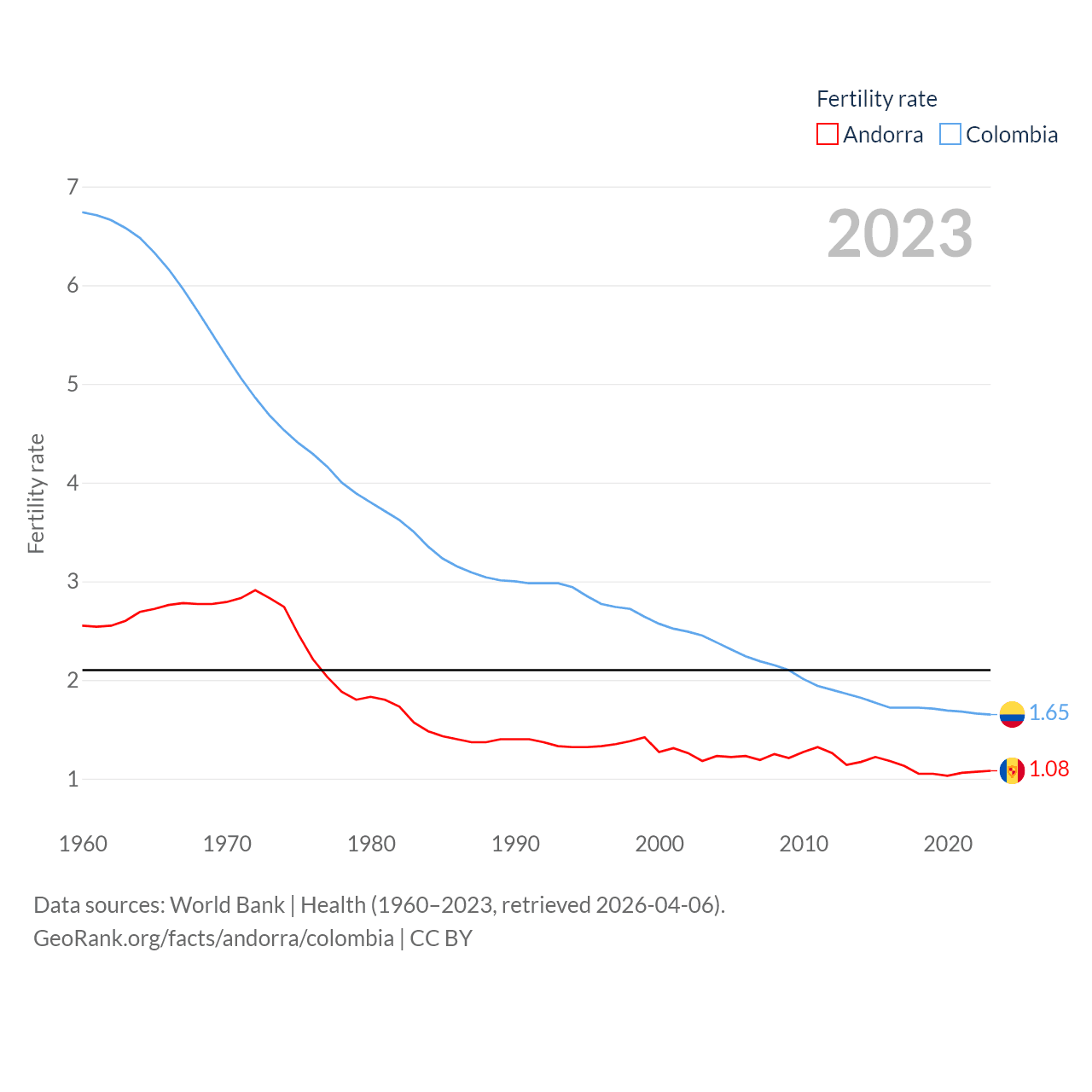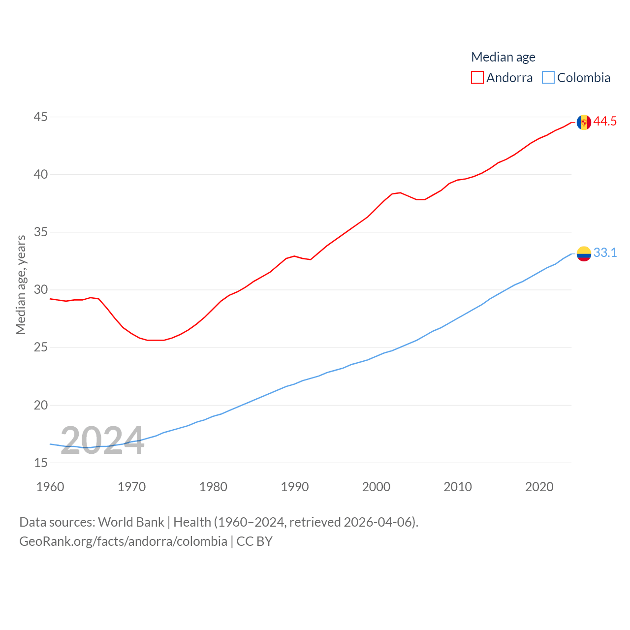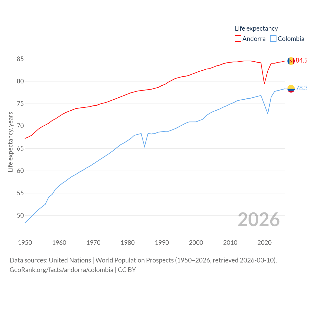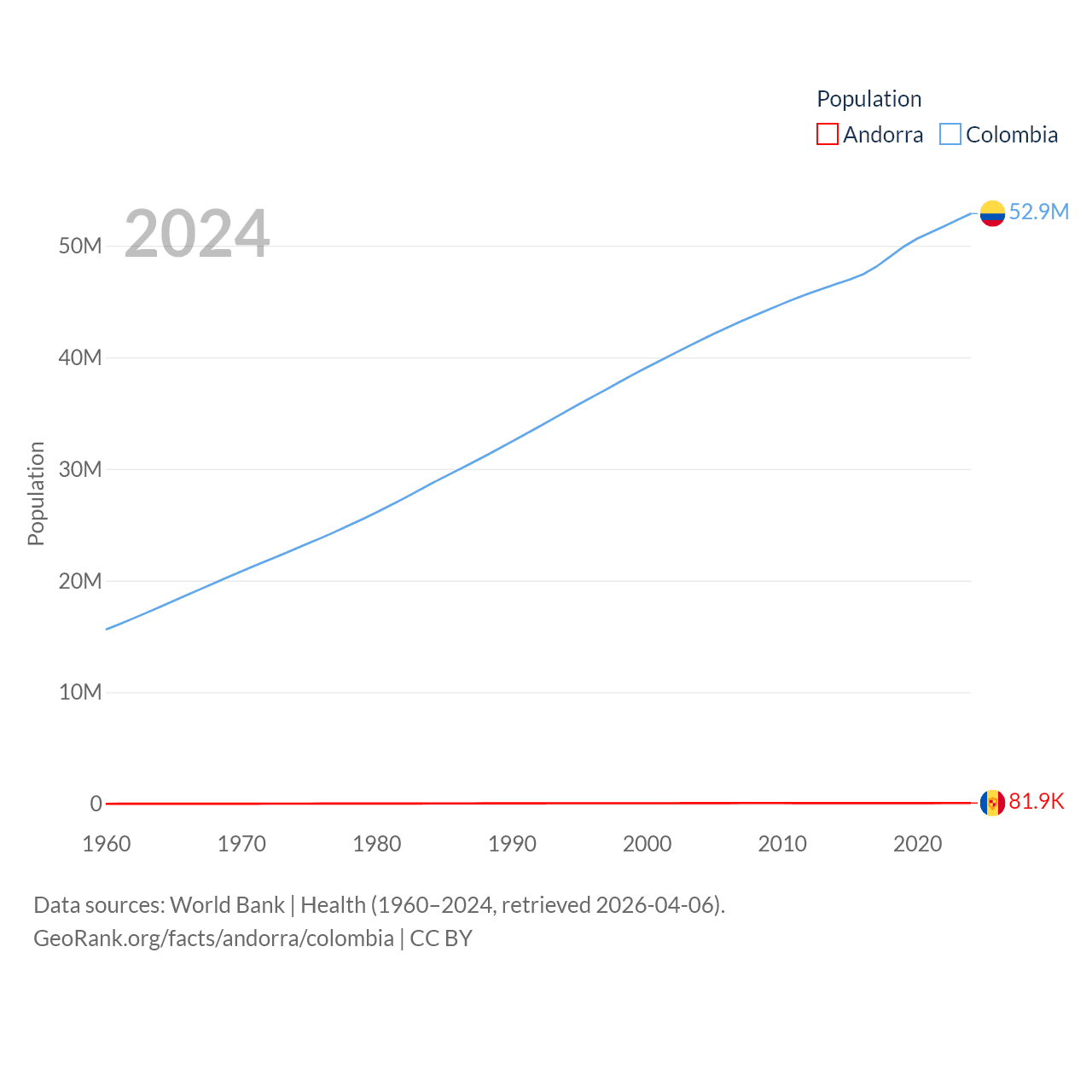 Andorra has a population of 81.9K (ranked 186/197), compared with 52.9M in Colombia (ranked 28/197). Andorra's land area is 181.5 sq mi versus 428,380 sq mi for Colombia (ranked 179th vs. 26th).